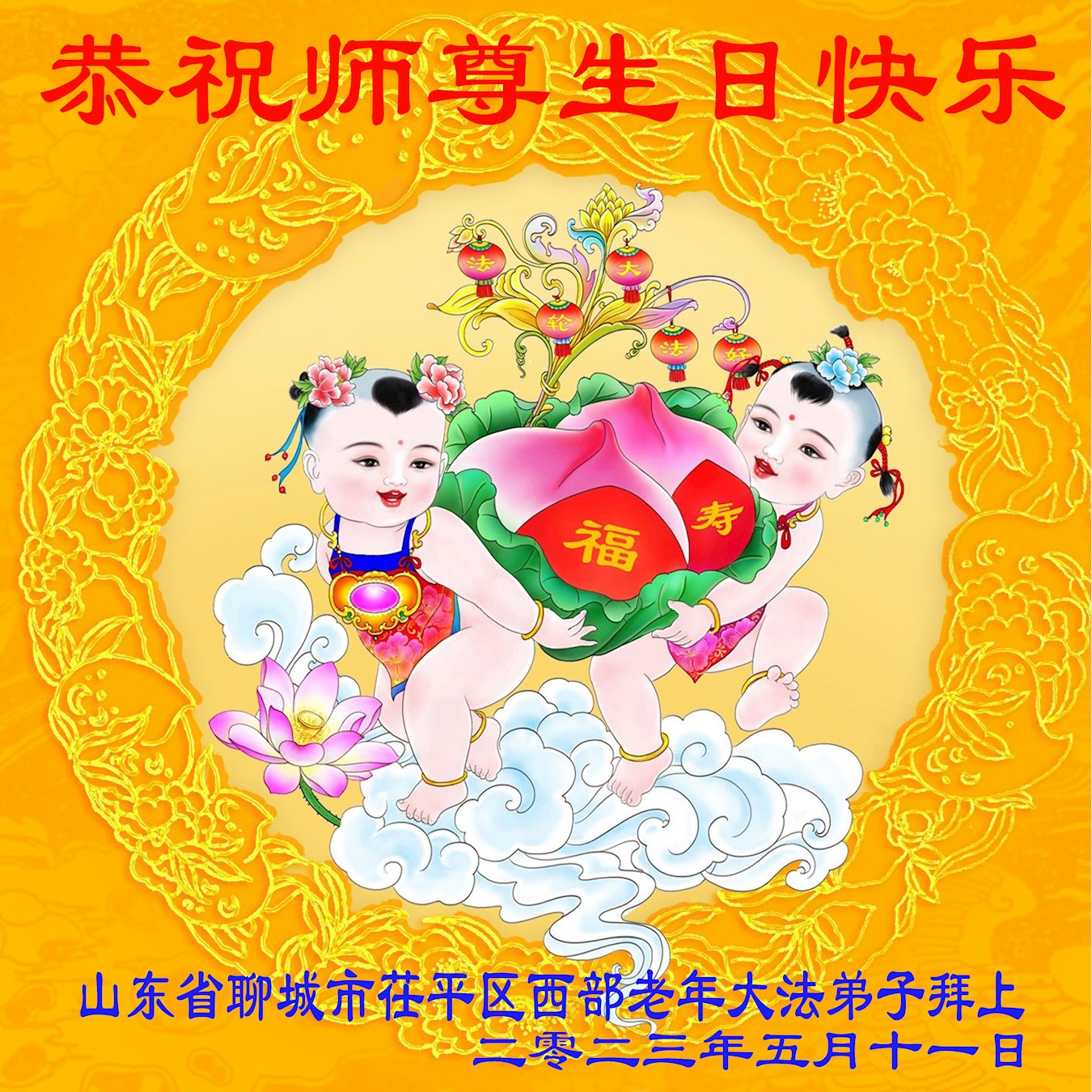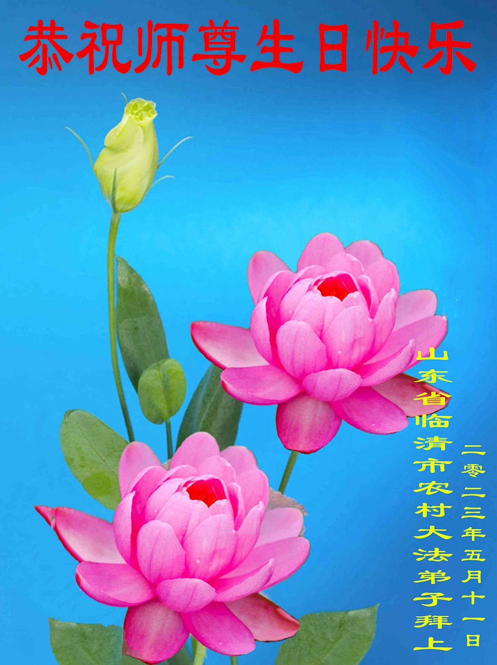 【明慧网二零二三年五月十四日】 山东省聊城市临清市农村大法弟子恭祝师尊生日快乐!