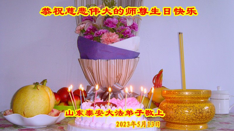【明慧网二零二三年五月十四日】 山东省烟台市福山区一大法弟子恭祝师尊生日快乐!恭贺世界法轮大法日!