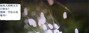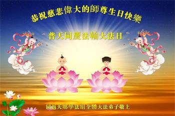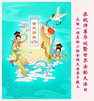 在这普天同庆世界法轮大法日、慈悲师尊华诞这个光辉节日之际,我们七人学法小组的全体大法弟子怀着对师尊无比感恩恭祝师尊生日快乐!师尊辛苦了!在这末劫末后的今天,我们一定要走好走稳师父安排的修炼道路,做好三件事,形成整体,改变观念,修好自己,跟师父回家。 大陆大法弟子恭祝师尊生日快乐!
