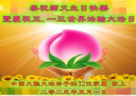 恭祝师父生日快乐暨庆祝五·一三世界法轮大法日! 中国大陆大法弟子家属共32人敬上 二零二三年五月一日 大陆青年大法弟子庆贺大法洪传三十一周年!