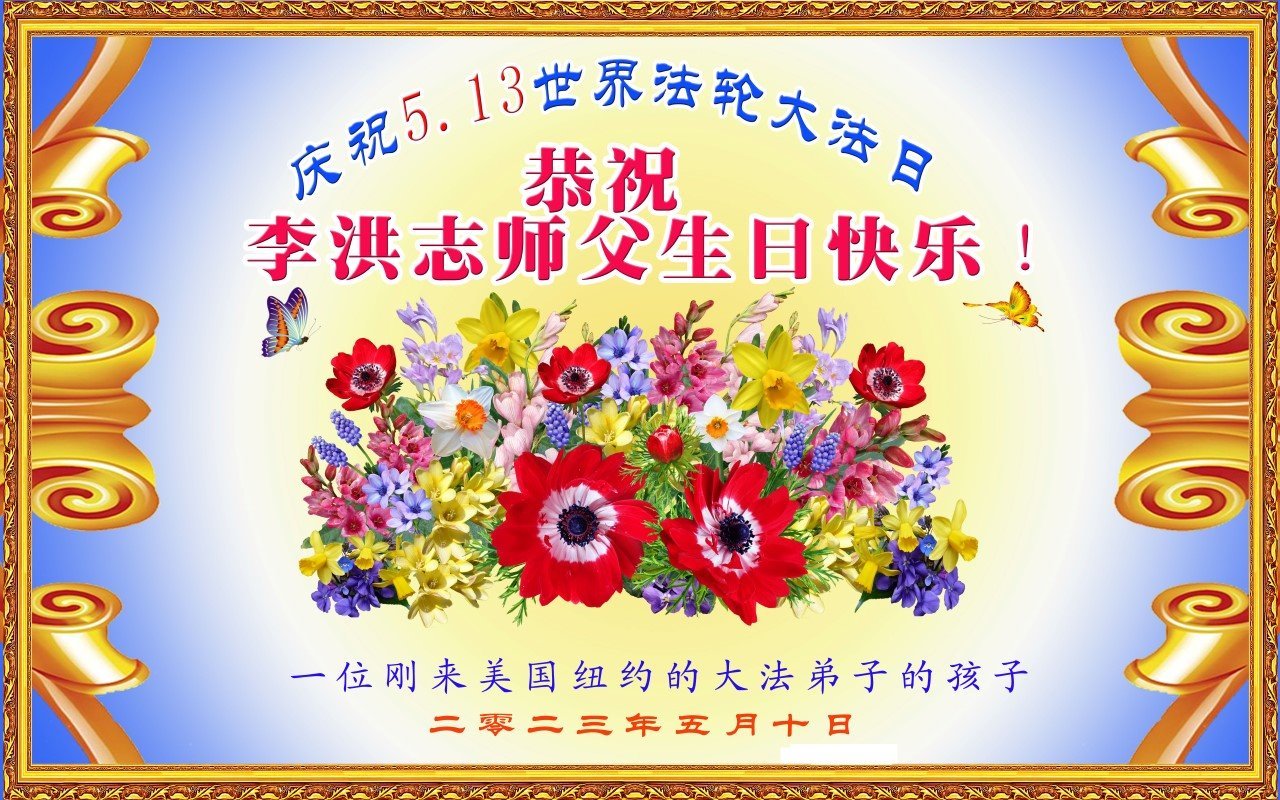 在这天上人间普天同庆法轮大法洪传世界31周年、恭祝慈悲伟大师尊华诞的节日里,弟子恭祝师尊生日快乐!师尊您辛苦了!弟子叩拜谢师恩! 长春在纽约的母女大法弟子叩拜 2023年5月 9日 一位刚从大陆来美国的大陆大法弟子的孩子恭祝李洪志师父生日快乐!