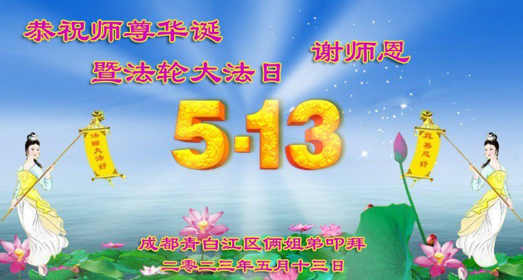 成都市全体大法弟子恭祝我们慈悲伟大的师尊5.13生日快乐!师父您辛苦了!洪恩浩荡,千言万语都说不尽了对您感激! 四川成都大法弟子敬贺世界法轮大法日!