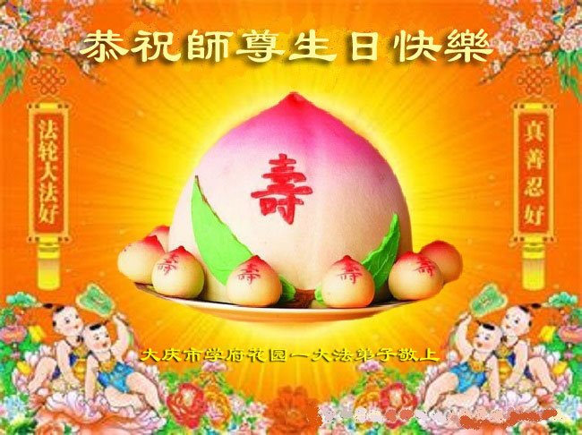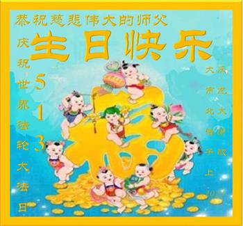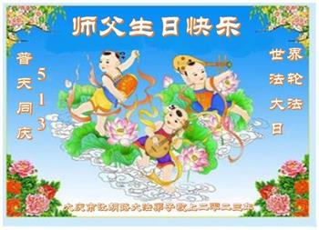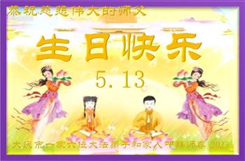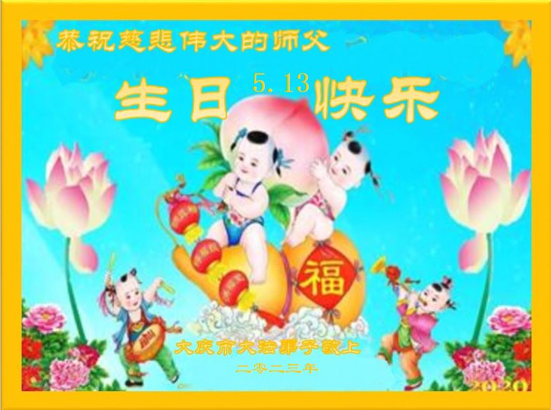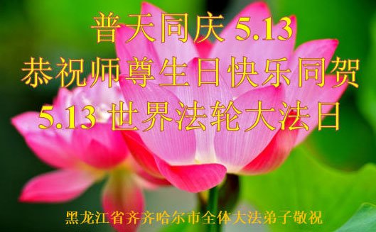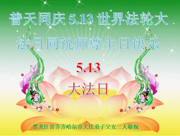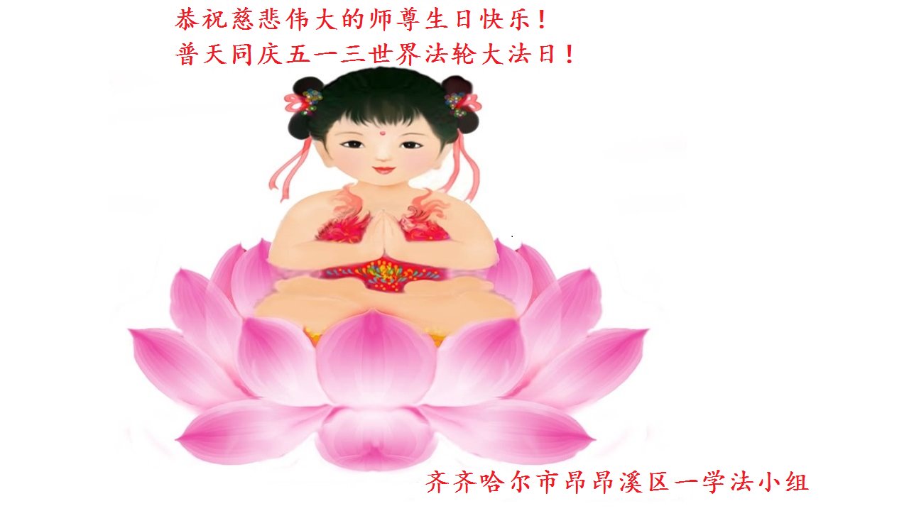 在五·一三到来之际,向慈悲伟大的师尊叩拜,恭祝师父生日快乐!师父辛苦了。谢谢师父在宇宙坏灭时期造就三界、造就人类,给众生从返天国世界的机会。谢谢师尊一路保护慈悲点化,使我能有幸助师正法,完成这神圣而又伟大的使命。 黑龙江省大庆大法弟子一学法小组大法弟子恭祝世界法轮大法日!恭祝师尊生日快乐!