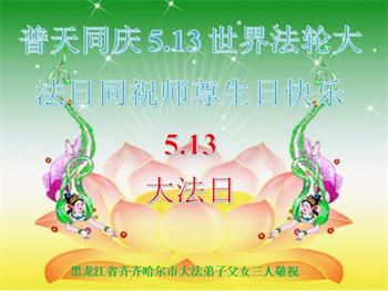 黑龙江省齐齐哈尔市大法弟子父女三人恭祝师尊生日快乐!