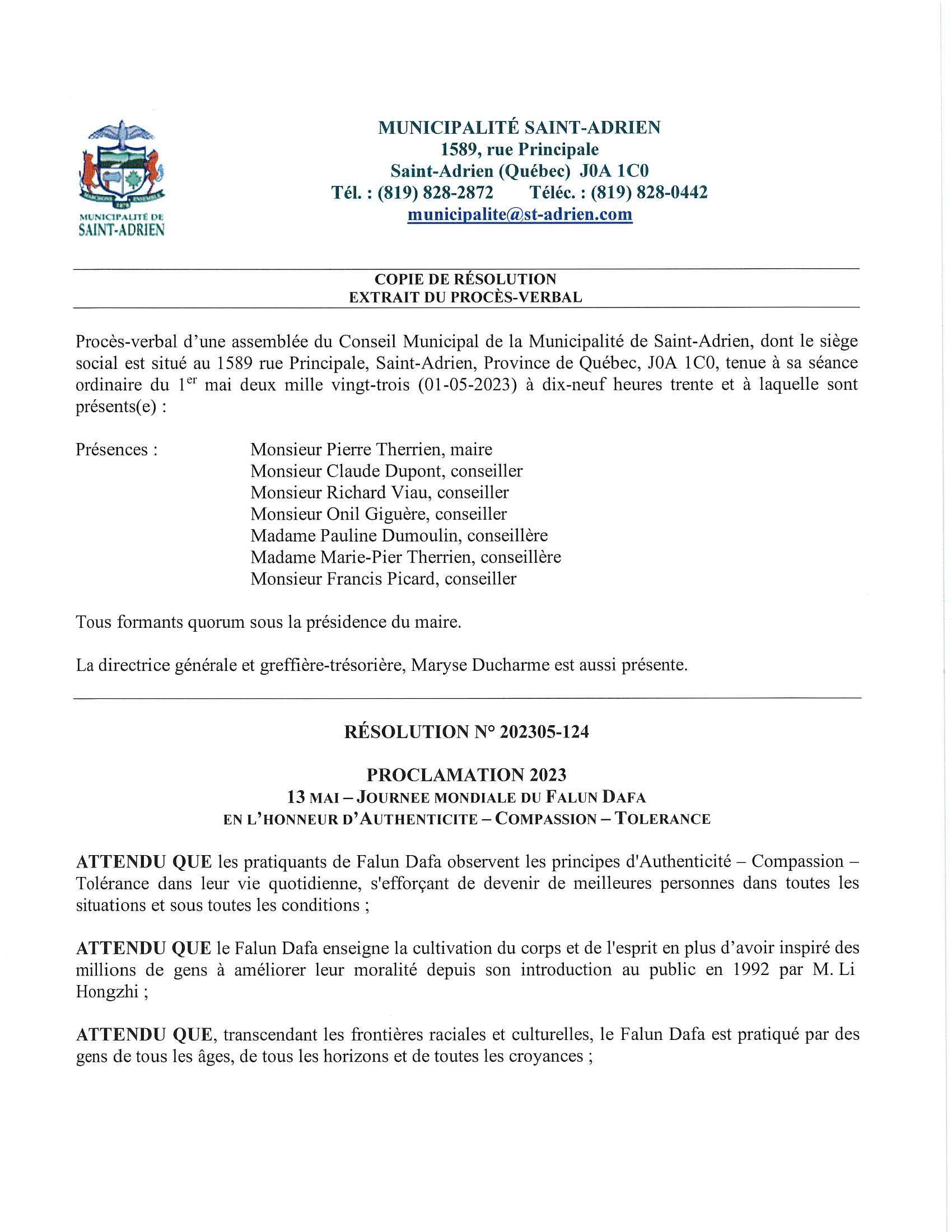 【明慧网二零二三年五月二十七日】二零二三年五月十三日是世界法轮大法日,也是法轮大法弘传世界三十一周年。加拿大魁北克省圣-阿德里安(Saint-Adrien)市议会和加蒂诺市议员布朗丹发褒奖函和贺信,恭贺法轮大法日,以表彰法轮大法真、善、忍原则给社会带来福祉。 |  | | 图1~2:圣-阿德里安(Saint-Adrien)市议会的褒奖令。 |