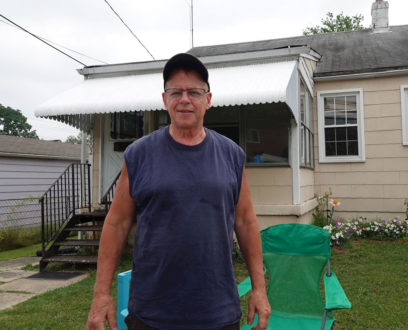 各行各业民众感受法轮大法的平和 斯坦利·塔克(Stanley Tucker)是马里兰州一家飞机制造公司的一线操作员。当游行队伍经过他家门前时,他向法轮功学员要了一份传单。塔克说,他以前在手机上看到过法轮功的信息,今天是第一次亲眼所见。谈到自己的感受,他说,法轮功学员带给他“平和,放松”,而且“大家步调一致”。  图12:斯坦利·塔克在家门前观看游行。 |