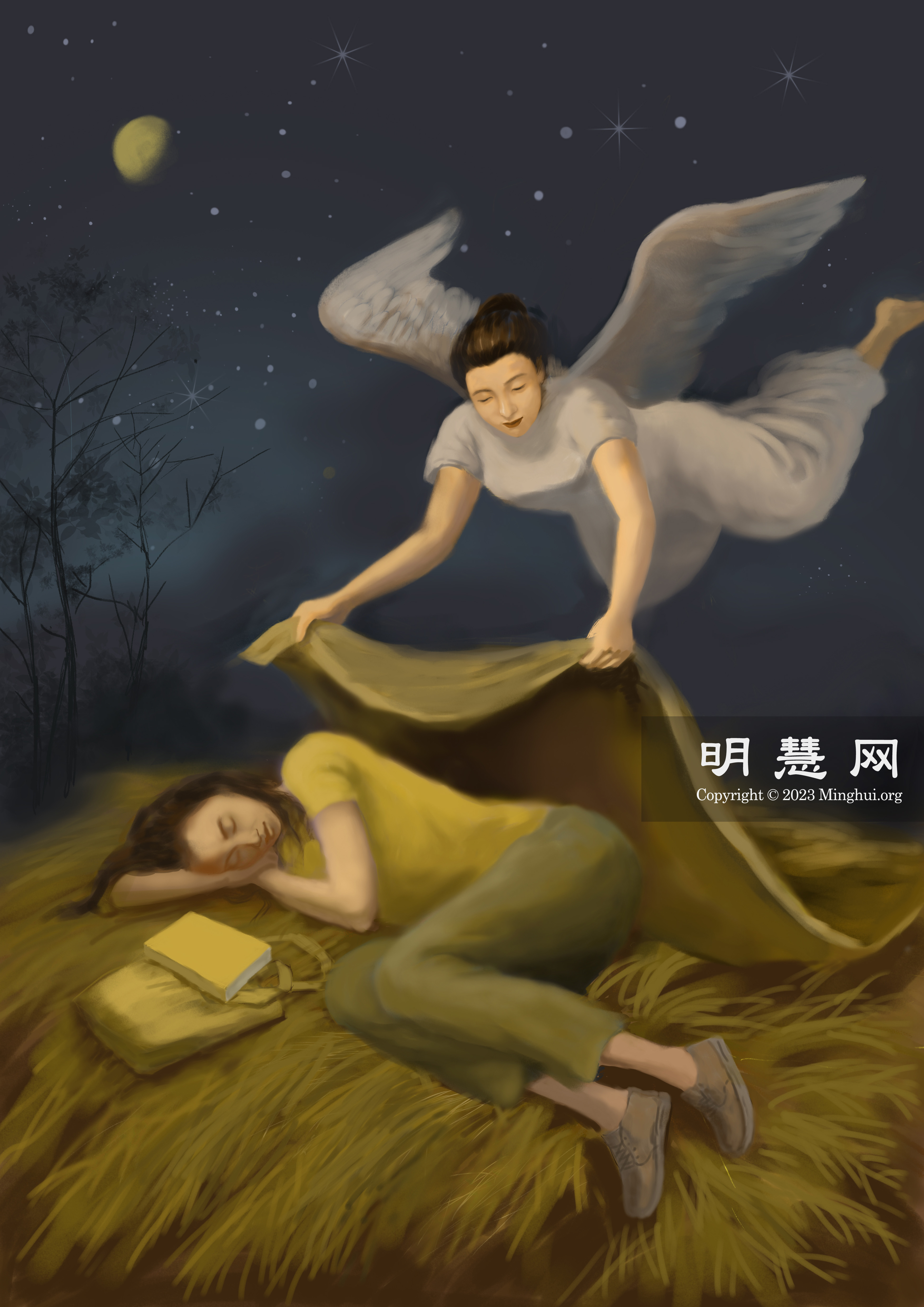 迫害,被迫流离失所,夜晚露宿干草堆,此时气温转凉,一位善良的天使为她盖上毯子。放在身边的大法书籍暗示着坚定的信仰。