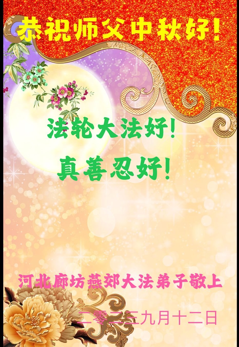 恭祝师父中秋好 法轮大法好、真善忍好! 河北廊坊燕郊大法弟子敬贺 二零二三年九月十二日 河北省廊坊市霸州市胜芳镇一学法组大法弟子恭祝师尊中秋节快乐!