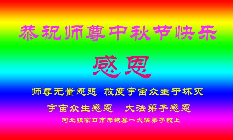 我们要多学法学好法,修去人心,紧跟师父正法進程,做好三件事,尽量多救人。 谢谢师父救度之恩! 张家口一学法小组大法弟子敬上 二零二三年九月十七日 河北省张家口市大法弟子恭祝慈悲伟大的师父中秋快乐!