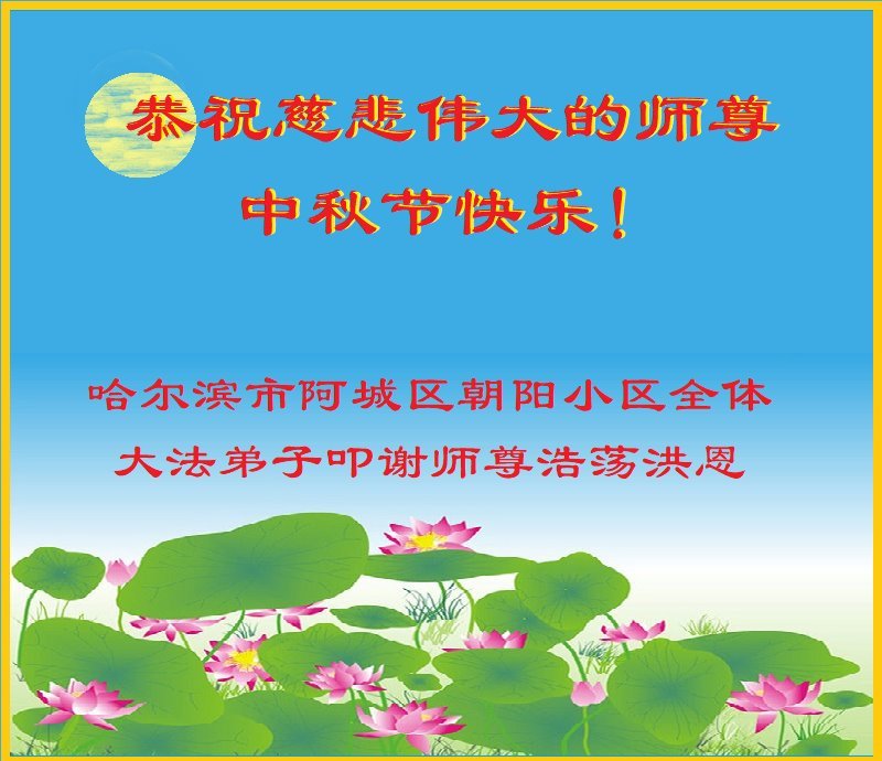 恭祝慈悲伟大的师尊中秋节快乐! 谢谢师尊救度之恩 学好法,做好三件事,圆满随师父回家。 哈尔滨市阿城区朝阳小区全体大法弟子叩谢师尊浩荡洪恩 黑龙江省哈尔滨市阿城市区河东一学法小组大法弟子恭祝慈悲伟大的师尊中秋节快乐!