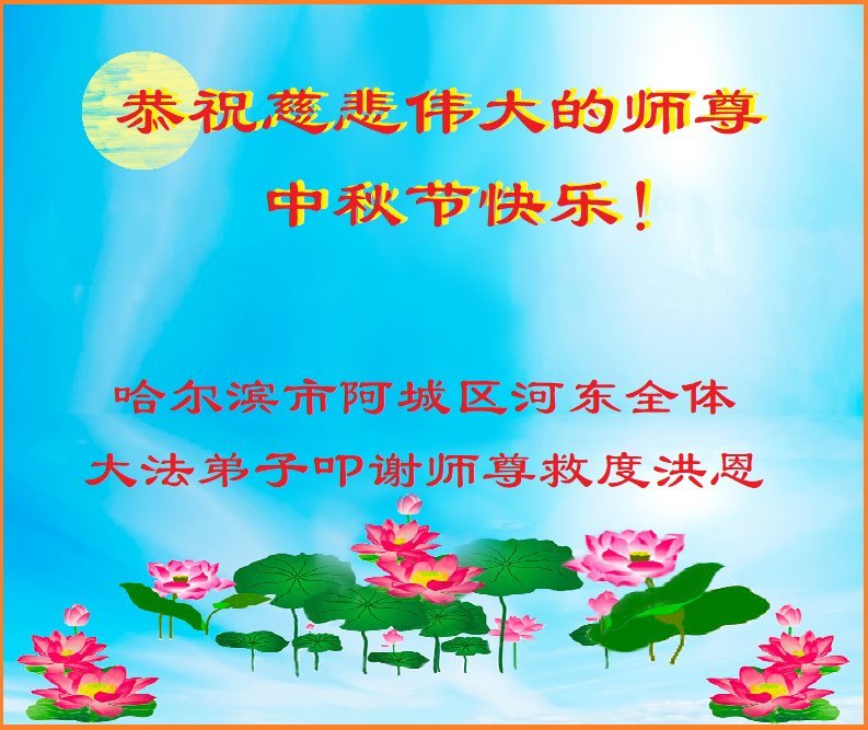 恭祝慈悲伟大的师尊中秋节快乐! 感谢师尊慈悲救度 要多学法,做好三件事,圆满随师还。 哈尔滨市阿城区河东全体大法弟子叩谢师尊浩荡洪恩 黑龙江省哈尔滨大法弟子恭祝慈悲伟大的师尊中秋节快乐!