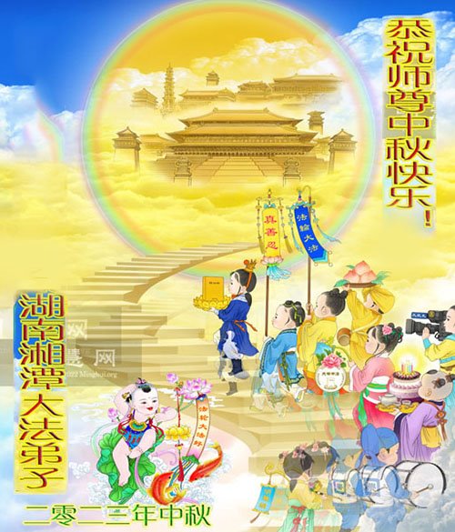 师尊辛苦了! 月到中秋分外明,每逢佳节倍思亲。在这个合家团圆的中秋佳节,我们岳阳市全体大法弟子无限想念您!慈悲伟大的师尊历尽千辛万苦,传法度人。在二十多年的血雨腥风中,引领着弟子们走出魔难,走向光明。师尊为弟子和众生承受了无尽的苦难,弟子们用尽人类的语言,也无法表达师尊对弟子的救度之恩!法正人间在即,大法弟子倍感使命与责任重大,弟子们唯有听师言,多学法、学好法,向内找,修心去执,珍惜分分秒秒,共同精進,共同提高,做好三件事,兑现誓约。惟愿师尊笑! 岳阳市全体大法弟子叩拜师尊! 湖南湘潭大法弟子恭祝师尊中秋快乐!