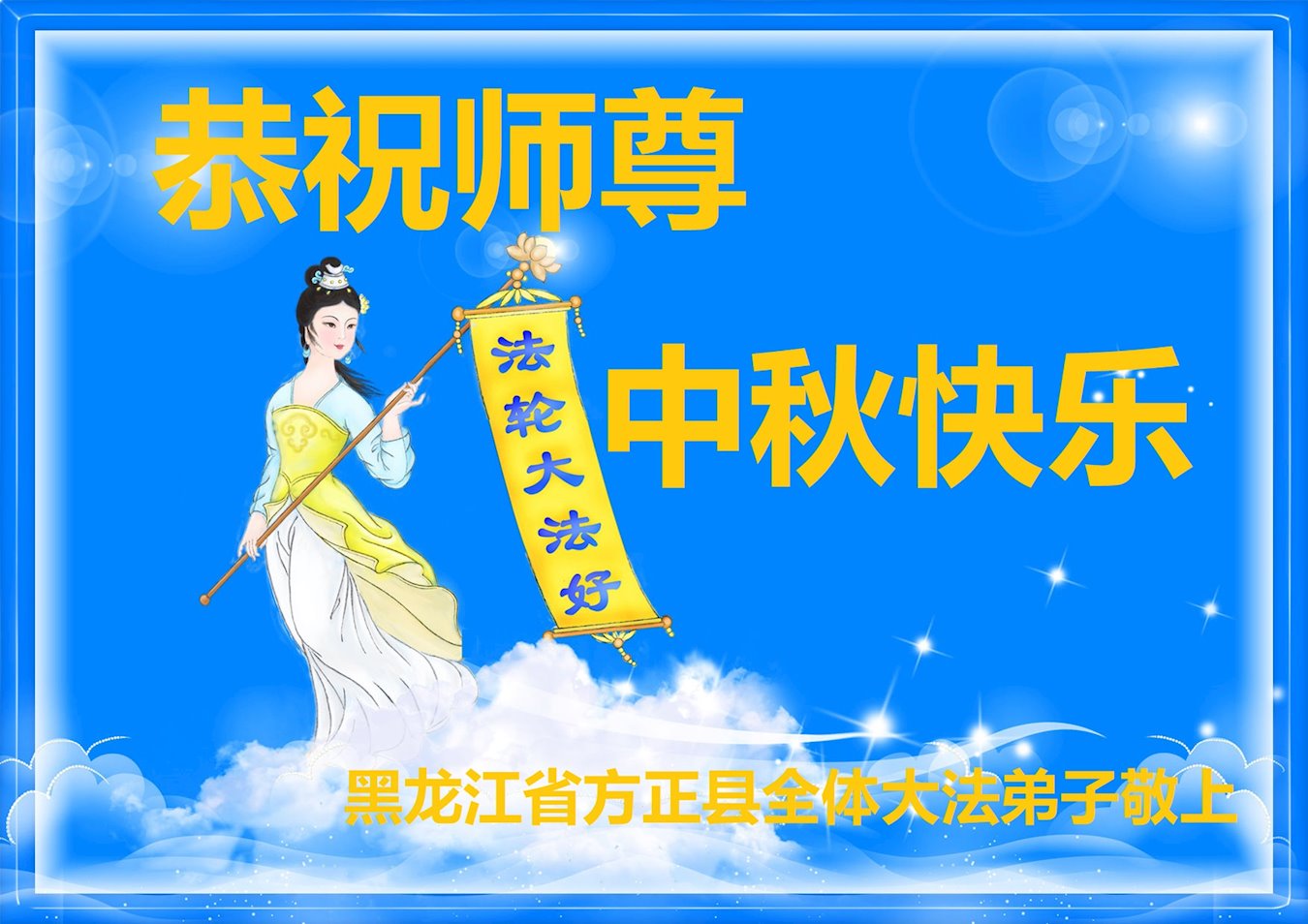 恭祝慈悲伟大的师尊中秋快乐! 师尊您好!师尊您辛苦了!弟子想念您! 最近我听《忆师恩》的文章,越听越爱听,仿佛自己就在当年师尊的传法班上,特别的幸福,也常常被师尊的洪大慈悲感动得泪流满面。师尊您为正大穹,救度苍宇众生历尽艰险,吃了无数的苦,费尽了心血,还要替弟子们承担无量的业债。对师尊的佛恩浩荡,弟子无以回报,只有抓紧修好自己,救度更多众生,少让师尊操心,才能不负师尊的慈悲救度。 黑龙江省依兰县大法弟子叩拜师尊 黑龙江省哈尔滨市方正县全体大法弟子恭祝慈悲伟大的师尊中秋快乐!