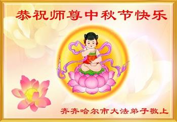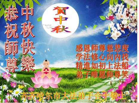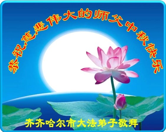 齐齐哈尔大法弟子恭祝慈悲伟大师尊中秋快乐! 中秋佳节遥祝叩拜师尊!感恩师父的慈悲伟大!无以言表! 唯有精進如初;修好自己回报师恩! 黑龙江省齐齐哈尔全体大法弟子恭祝慈悲伟大师尊中秋快乐!