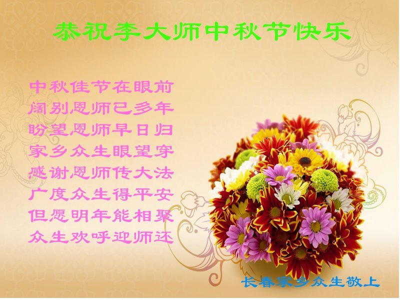 中秋佳节在眼前 阔别恩师已多年 盼望恩师早日归 家乡众生眼望穿 感谢恩师传大法, 广度众生得平安 但愿明年能相聚 众生欢呼迎师还 长春家乡众生敬上 四川省成都市彭州市明白真相众生恭祝李大师中秋快乐!