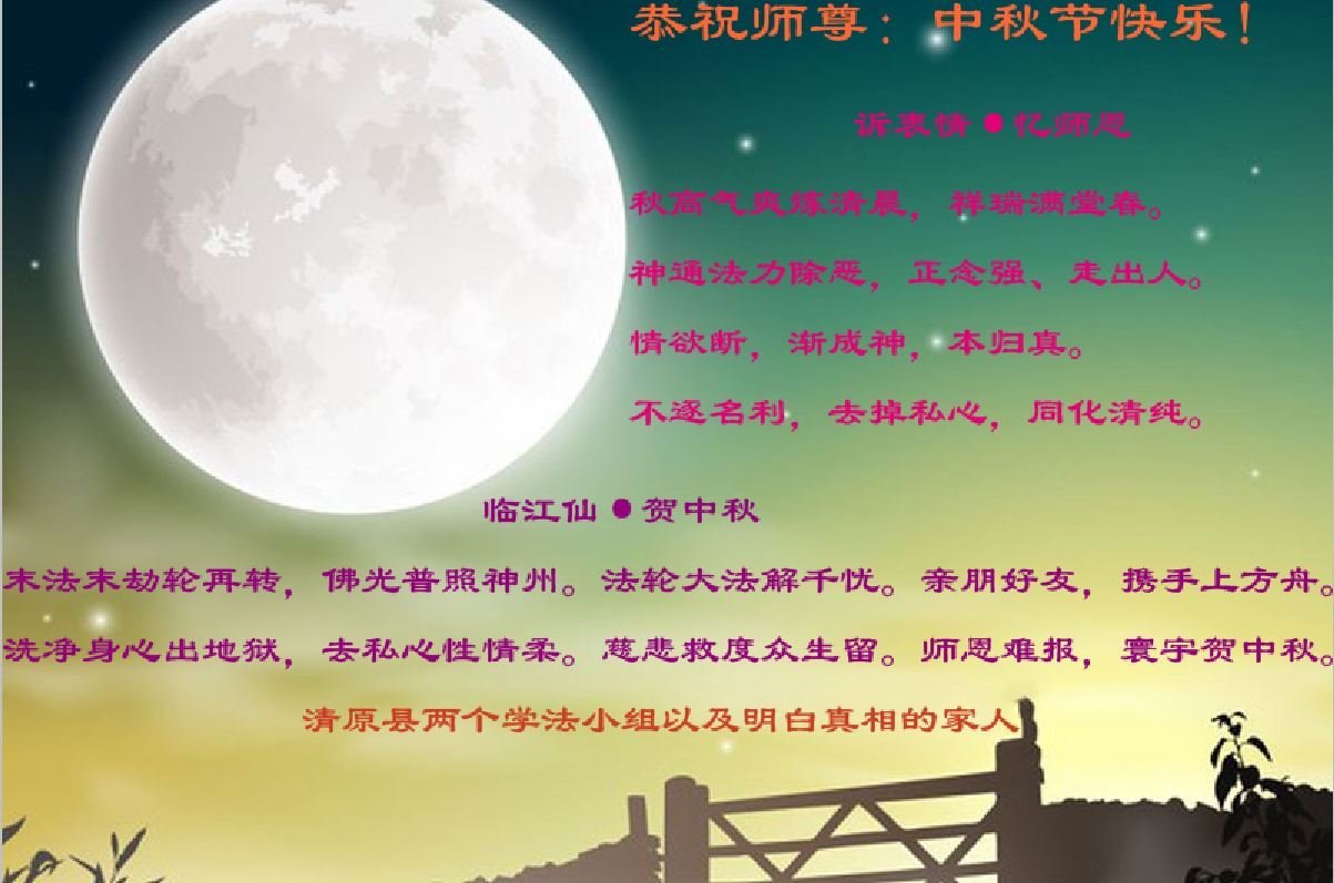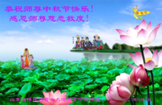 慈悲伟大的师尊:中秋佳节好!您教弟子们按真善忍做好人,明真相的家人也在按真、善、忍做好人。遇到问题也向内找,先生时常做好事,做事先为别人着想,改掉了许多党文化的不良习惯。他们都感恩慈悲伟大的师尊! 山东聊城茌平区学法点全体大法弟子恭祝慈悲伟大的师父中秋快乐!