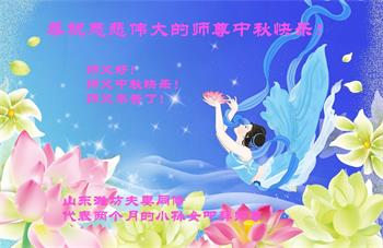 山东潍坊临朐一对夫妻同修代表刚出生两个多月的小孙女恭祝慈悲伟大的师尊中秋快乐!
