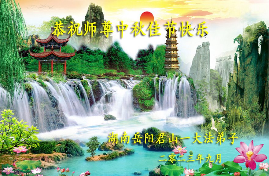 光阴似箭,转眼又到了中秋时。弟子们时刻思念慈悲伟大的师尊!用尽人间语言道不尽对师尊的感恩。弟子们唯有精進、再精進。放下人心、人念、人情真修、实修,多救人。以报师恩。 沅江全体大法弟子叩拜! 湖南岳阳君山一大法弟子恭祝师父中秋佳节快乐!