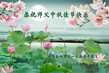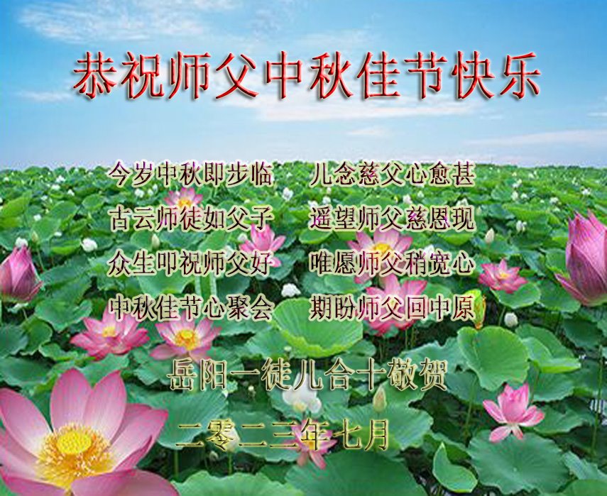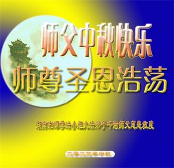 今岁中秋即步临 儿念慈父心愈甚 古云师徒如父子 遥望师父慈恩现 众生叩祝师父好 惟愿师父稍宽心 中秋佳节心聚会 期盼师父回中原 徒儿合十敬贺 湖南省衡阳市东阳渡镇大法弟子恭祝师父中秋快乐!