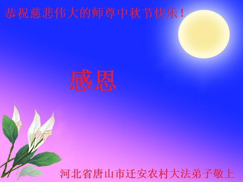 山东海阳乡村大法弟子敬祝慈悲伟大的师尊中秋快乐! 弟子借中秋之际,感谢师父为弟子所做的一切,这是弟子不能用语言能表达的,弟子唯有修好自己,多救人,给师尊添一份欣慰! 祝师尊中秋快乐! 河北省唐山市迁安农村大法弟子恭祝师尊中秋节快乐!