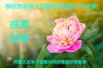 师父好! 法轮大法好! 真善忍好! 感恩创世主师尊慈悲救度! 听师父话! 一定学好法! 修炼如初! 救度世人! 普度众生!勇猛精進!圆满随师还!对师父,唯有感恩。对大法,无条件同化。 荷兰大法弟子至善叩拜师尊谢师尊圣恩! 德国一家母女大法弟子恭祝慈悲伟大的师尊中秋节快乐!愿师尊常常开颜笑!