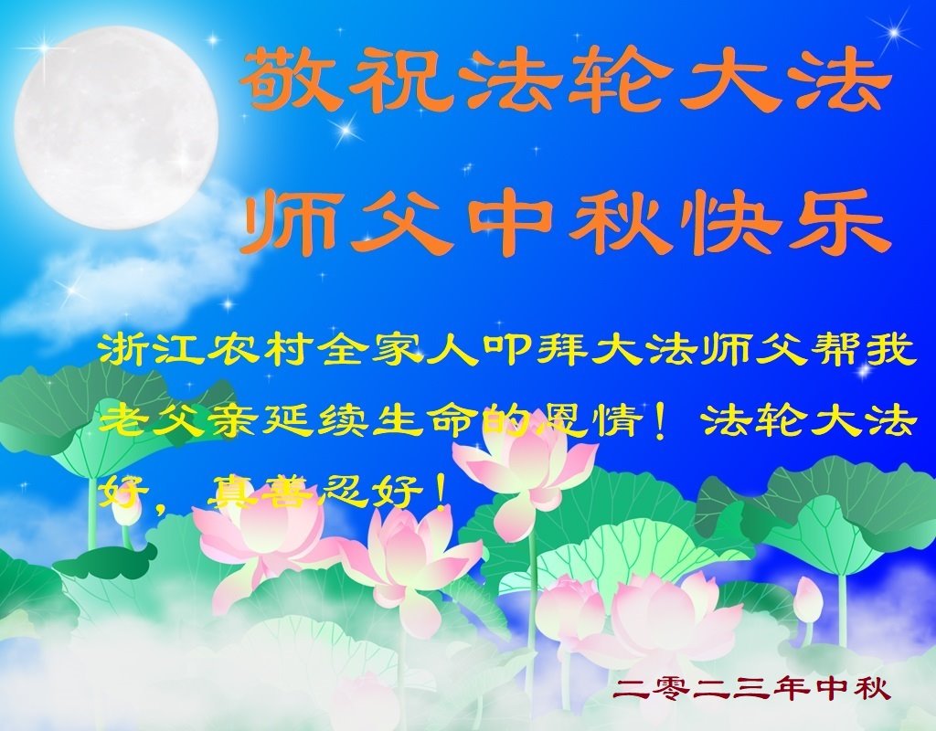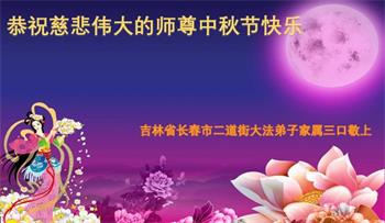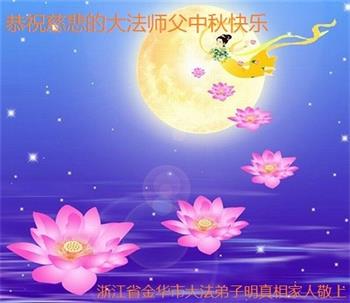 师父您好!祝师父中秋节快乐!我们从心里相信法轮功是好的。法轮大法好!真善忍好!在北京昌平经商的一明真相世人全家敬祝! 浙江省金华市大法弟子明真相家人恭祝慈悲的大法师父中秋快乐!