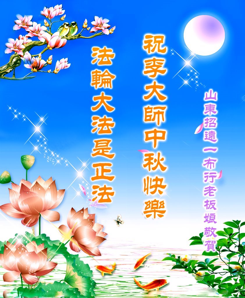 山东烟台招远一布行老板娘恭祝李大师中秋快乐! 法轮大法是正法。大法弟子都是好人。如果人人都能按照大法讲的那样做人,世上就没有坏人了,治安状况也好了。中共邪*党-无神论害人不浅,使人们随心所欲,骂天怨地,招来了无数灾难,使人面临大淘汰。 李大师的两篇新经文揭示了人的起源根底,久远年代,人间就有传说,盘古开天地,女娲造人,我相信这是真的。人就应该敬天敬地,积德行善才能得福报。我们家相信大法,按真、善、忍做好人,买卖兴隆,福报连连。谢谢李大师救人出苦海的大恩大德!祝贺李大师中秋节快乐! 北京翻墙人恭祝李大师中秋快乐!