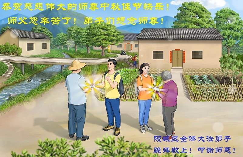 感恩师尊慈悲救度,跪拜师尊,弟子唯有精進,做好三件事。山东德州大法弟子叩拜敬上。 山东德州陵城区全体大法弟子恭祝伟大的师尊中秋快乐!