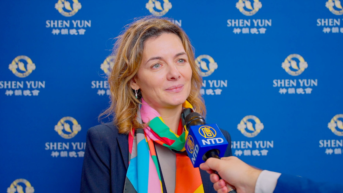 马泰奥·科扎(Matteo Cozza)是意大利国际知名品牌服饰公司TRANSIT的总裁。太太劳拉(Lara Piccolo)则是意大利一家有机葡萄酒酒庄老板。当天,他们驱车三小时,专程从意大利北部名城维琴察赶到佛罗伦萨观看神韵,演出之美以及所蕴含的文化内涵让他们感到震撼。 “这种色彩、音乐和氛围,真是太美了。”马泰奥·科扎表示,“(神韵)这种严谨、这种传统、这种优雅、这种专业精神,真的,我要向他们(神韵艺术家)致敬!” 太太劳拉(Lara Piccolo)赞神韵:“她(神韵)有一种直抵心灵的非凡力量,能在你心中激起强烈的情感共鸣。”科扎补充说:“那是一种直抵心灵的多层次共鸣。” 葡萄酒专家赞神韵通过艺术分享文化 非凡独特 2023年12月31日下午,国际葡萄酒专家阿黛琳·马里内拉(Marinela Ardelean)女士特意从威尼斯赶来佛罗伦萨,只为一睹神韵风采。她称赞神韵通过艺术分享文化,非凡独特。她说:“我被震撼了。”  图8:国际葡萄酒专家马里内拉·阿黛林(Marinela Ardelean)对于神韵以卓越非凡的艺术形式向世界分享中国传统文化感到十分钦佩。(新!唐!人:) |