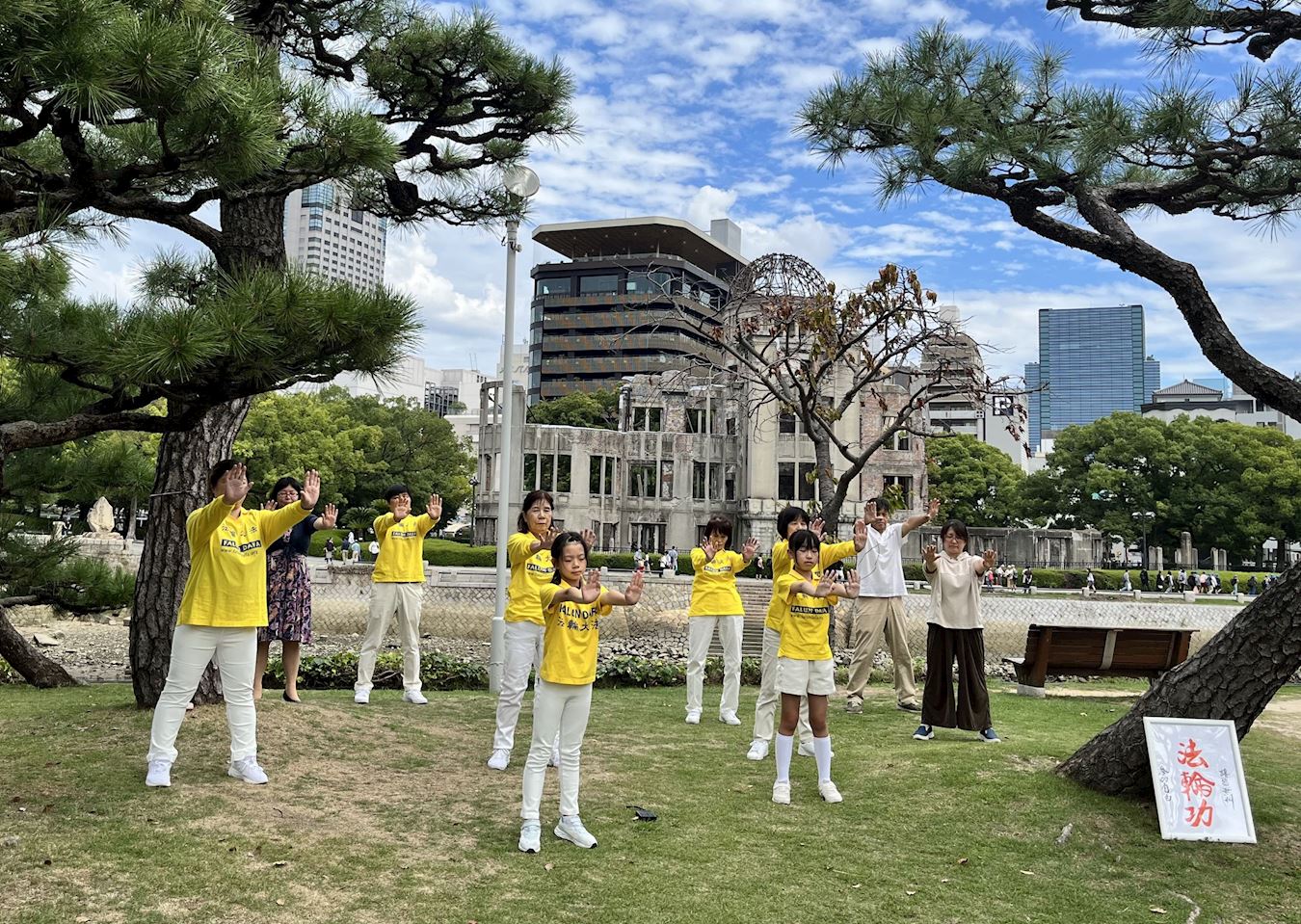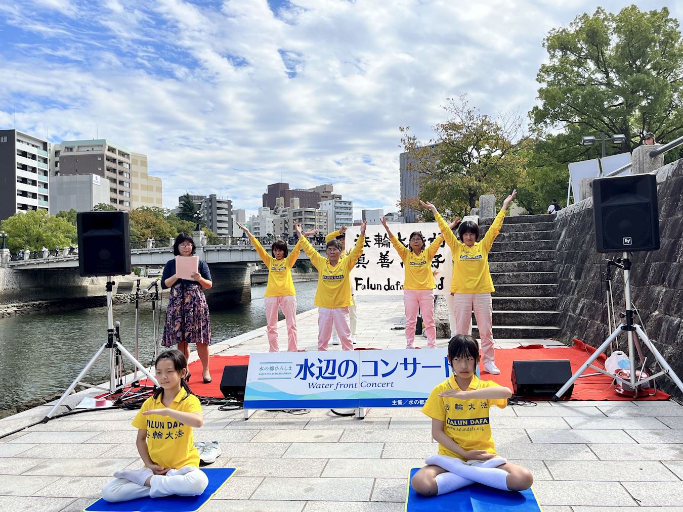 | 【明慧网二零二四年十月十五日】十月秋高气爽、瓜果飘香,是人们纷纷走出家门外出旅游的季节。二零二四年十月十四日,日本广岛法轮功学员在游客聚集的广岛和平公园参加了水滨音乐会,并集体炼功,展现法轮大法的美好。水滨音乐会筹备委员会代表说:“感谢法轮功学员为我们带来如此丰富的节目。” 在水滨音乐会介绍法轮功 广岛有“水都”之称。水滨音乐会是广岛市利用得天独厚的水滨魅力,创造了生机勃勃的水滨区域吸引游客。当地法轮功学员曾多次参加该音乐会,受到好评,本次再度受到邀请。 在水滨音乐会上,法轮功学员演示了法轮功的五套功法、朗诵故事“了不起的米饭”、演奏钢琴曲“得度”和配乐演示书法。由于欧美游客络绎不绝,法轮功学员同时使用日语和英语主持该活动。  图1~2:二零二四年十月十四日,广岛法轮功学员在水滨音乐会上演示法轮功的五套功法。 |