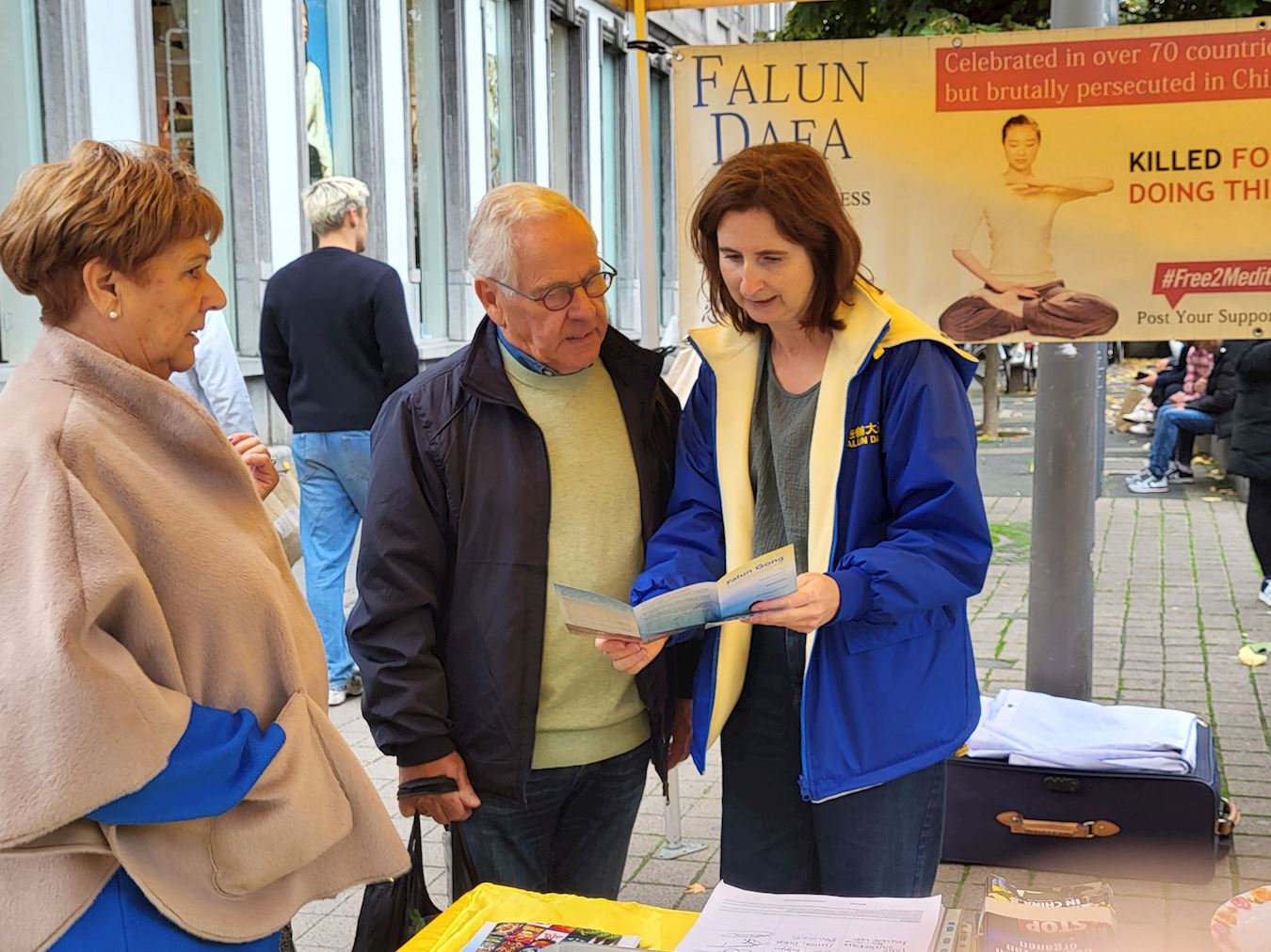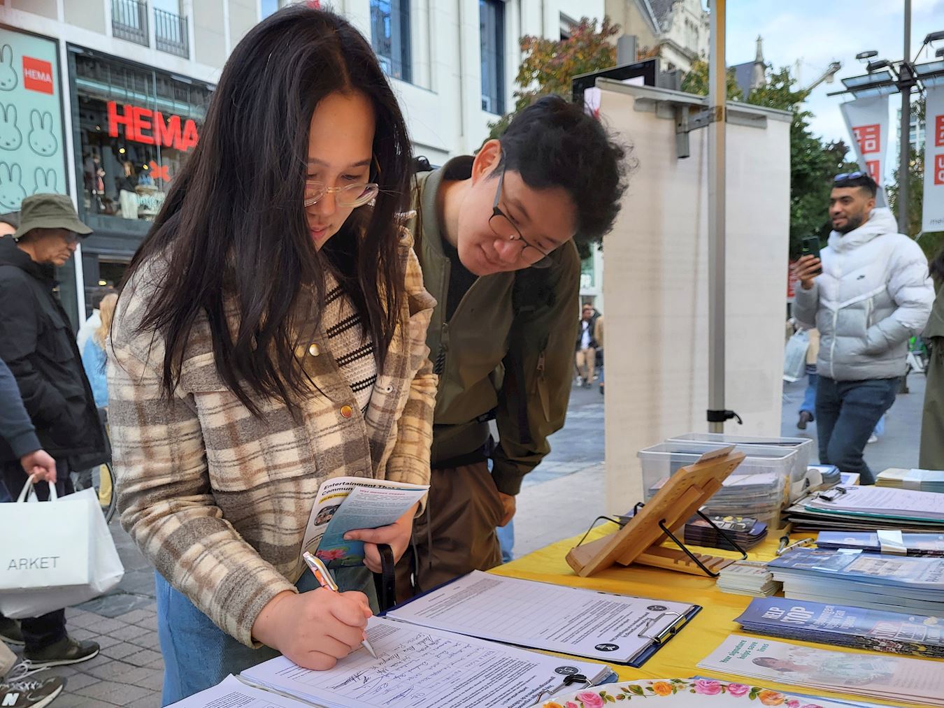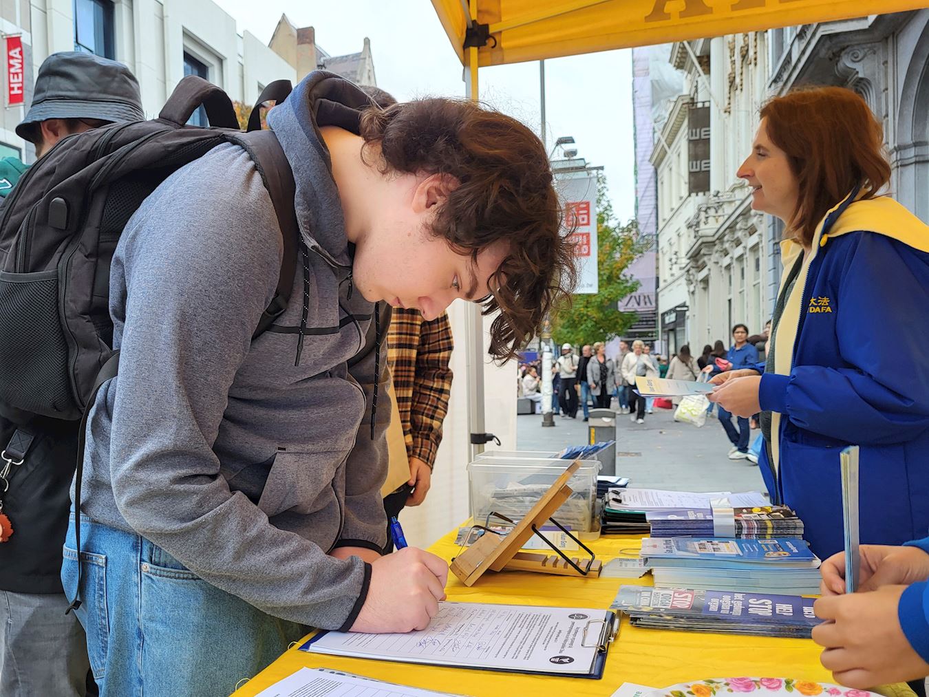 科内尔·范·德·维弗(Korneel van de Vijver),吉尔伯特(Gilbert),史蒂文·阿诺茨(Steven Arnauts)三位比利时根特大学理工科的大学生,被学员的打坐炼功吸引,看过后,走向法轮功帐篷前的展桌。他们都是第一次看到有关法轮功的情况介绍;他们渴望了解与法轮功相关的信息,与法轮功学员交谈许久。 当他们接受采访时争先恐后的谈论着自己的想法和认识。他们表达着看到学员打坐的感受,这个说,他们很放松,而且功法看起来很好,可是为什么在中国会被禁止?那个说,我仅仅是看着他们(炼功),就给我带来了平静,很真实。还说这对所有人都有好处等。 他们对发生强摘法轮功学员器官很关心,他们问它们(中共)怎么做到的?有没有人关心这个事情?听了迫害真相后,他们认为就象知道的中国网络防火墙,它们(中共)给出的理由是保护人民,但肯定更多的是为了控制人民而不是保护。同样,在国际社会,因为它(强摘器官)没有传播开来。而且它(强摘器官)也一直保密。他们(中共)试图隐藏它(真相),这样他们就不会被质问。这样其他世界领导人就不必询问它,甚至不知道它。他们觉得这是中国的一个大问题。 科内尔说:“我之所以在请愿书上签名,是因为我看到他们(展示法轮功功法的学员)做的很好,我签名是支持他们反迫害,哪怕仅仅是签名的小事情,但能有所帮助,我还是应该去做的。” 吉尔伯特说:“我签名是支持这些人。迫害这些和平的人是很愚蠢的。” 史蒂文说,我想通过签名能够帮助他们,因为我认为不让法轮功学员打坐炼功是不公平的。炼功是无害的。他还说:“我不喜欢他们因为自己的信仰而受到压迫。我反对这场迫害。” 他们还谈了对法轮大法修炼原则真善忍的认识,科内尔说,我喜欢这个(真善忍)。我认为这些都是值得遵循的良好价值观。这些都是作为人类应该拥有的良好价值观。 史蒂文说,真善忍,我认为这三个原则可以帮助人们。这确实是有一些人在生活中需要的东西。因为有些人生活中有压力,他们需要某种方式来释放压力,释放一切,我认为这(遵循真善忍)对他们来说是完美的方式。 吉尔伯特说,它确实给人们带来了平静。这是每个人都需要做的事情。它真的有助于心灵。这是一个非常忙碌、残酷的世界,像这样的按照真善忍(修炼打坐)真的有助于平静心灵。 他们一致认为,真善忍非常好。这些人(法轮功学员)正在做善事。世界必须改变。他们认真的表示,也许明年我们会和你们一起站在这里。  图3~8:了解法轮功和迫害真相的民众 |