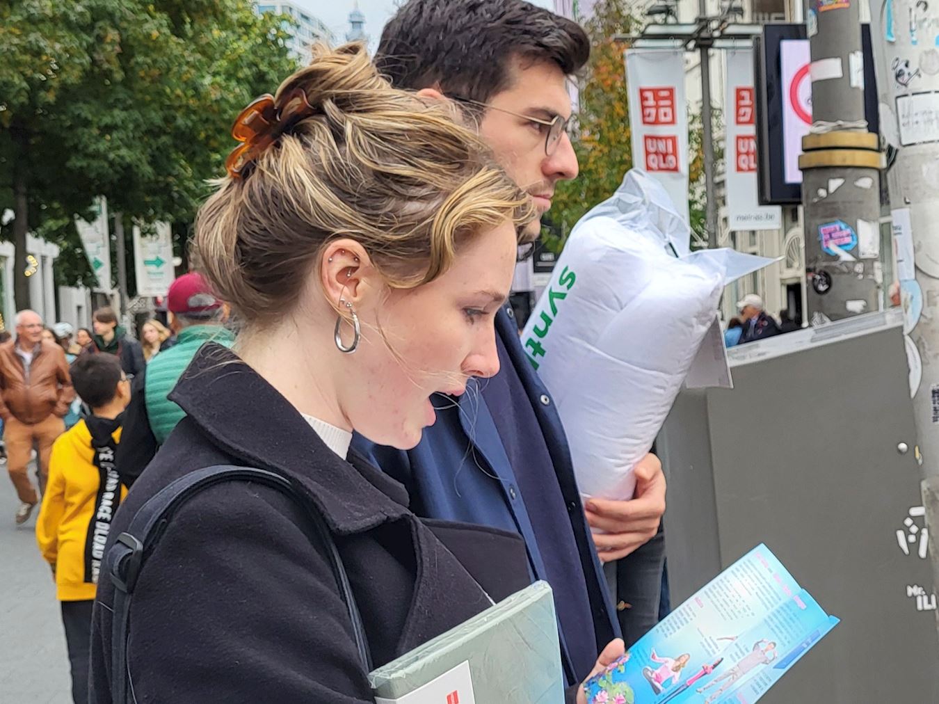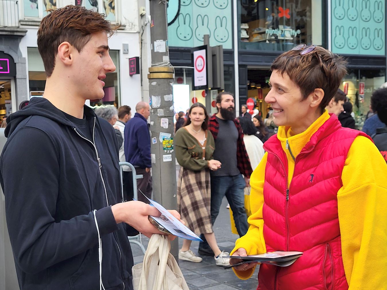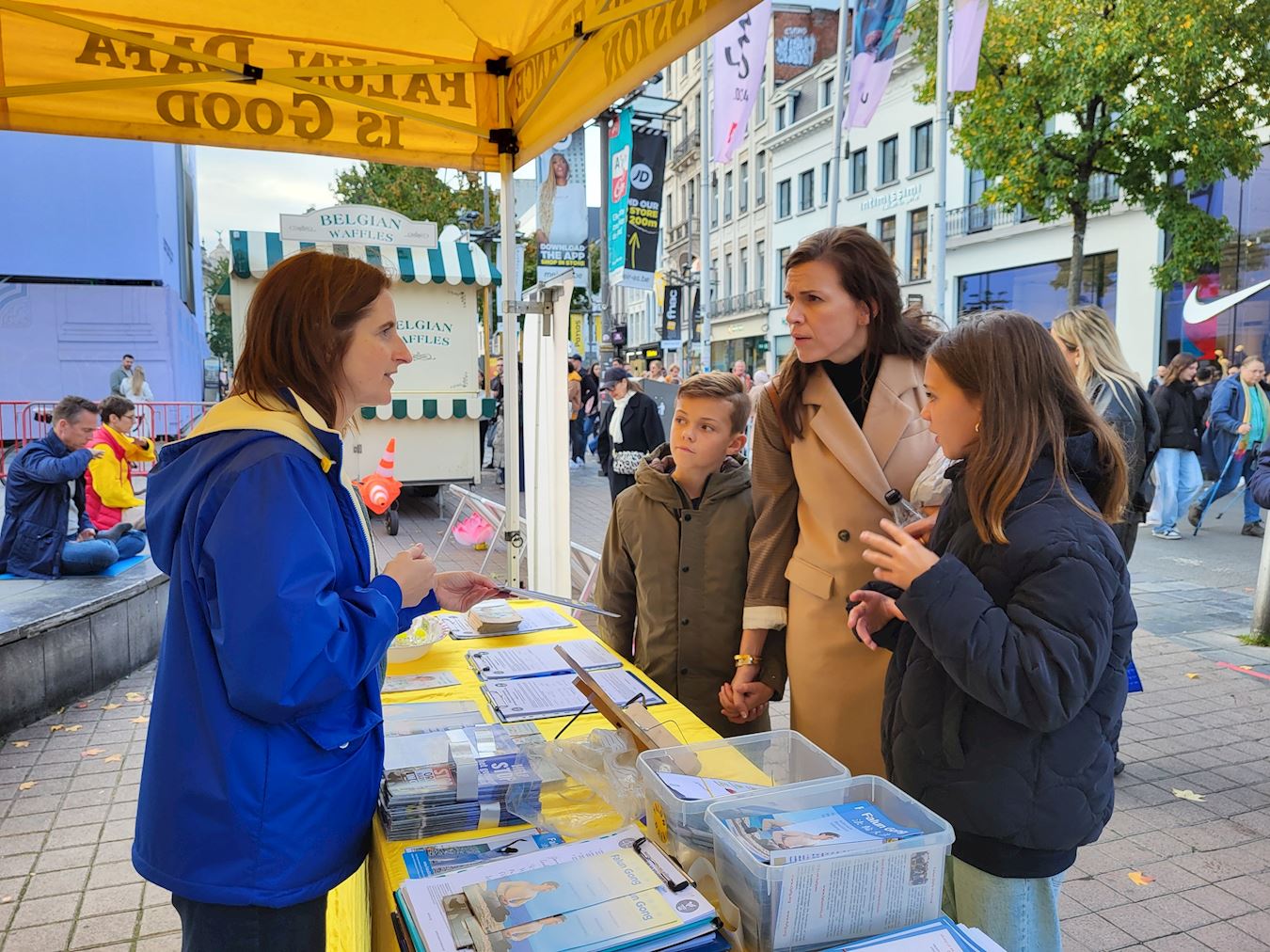 科内尔·范·德·维弗(Korneel van de Vijver),吉尔伯特(Gilbert),史蒂文·阿诺茨(Steven Arnauts)三位比利时根特大学理工科的大学生,被学员的打坐炼功吸引,看过后,走向法轮功帐篷前的展桌。他们都是第一次看到有关法轮功的情况介绍;他们渴望了解与法轮功相关的信息,与法轮功学员交谈许久。 当他们接受采访时争先恐后的谈论着自己的想法和认识。他们表达着看到学员打坐的感受,这个说,他们很放松,而且功法看起来很好,可是为什么在中国会被禁止?那个说,我仅仅是看着他们(炼功),就给我带来了平静,很真实。还说这对所有人都有好处等。 他们对发生强摘法轮功学员器官很关心,他们问它们(中共)怎么做到的?有没有人关心这个事情?听了迫害真相后,他们认为就象知道的中国网络防火墙,它们(中共)给出的理由是保护人民,但肯定更多的是为了控制人民而不是保护。同样,在国际社会,因为它(强摘器官)没有传播开来。而且它(强摘器官)也一直保密。他们(中共)试图隐藏它(真相),这样他们就不会被质问。这样其他世界领导人就不必询问它,甚至不知道它。他们觉得这是中国的一个大问题。 科内尔说:“我之所以在请愿书上签名,是因为我看到他们(展示法轮功功法的学员)做的很好,我签名是支持他们反迫害,哪怕仅仅是签名的小事情,但能有所帮助,我还是应该去做的。” 吉尔伯特说:“我签名是支持这些人。迫害这些和平的人是很愚蠢的。” 史蒂文说,我想通过签名能够帮助他们,因为我认为不让法轮功学员打坐炼功是不公平的。炼功是无害的。他还说:“我不喜欢他们因为自己的信仰而受到压迫。我反对这场迫害。” 他们还谈了对法轮大法修炼原则真善忍的认识,科内尔说,我喜欢这个(真善忍)。我认为这些都是值得遵循的良好价值观。这些都是作为人类应该拥有的良好价值观。 史蒂文说,真善忍,我认为这三个原则可以帮助人们。这确实是有一些人在生活中需要的东西。因为有些人生活中有压力,他们需要某种方式来释放压力,释放一切,我认为这(遵循真善忍)对他们来说是完美的方式。 吉尔伯特说,它确实给人们带来了平静。这是每个人都需要做的事情。它真的有助于心灵。这是一个非常忙碌、残酷的世界,像这样的按照真善忍(修炼打坐)真的有助于平静心灵。 他们一致认为,真善忍非常好。这些人(法轮功学员)正在做善事。世界必须改变。他们认真的表示,也许明年我们会和你们一起站在这里。  图3~8:了解法轮功和迫害真相的民众 |