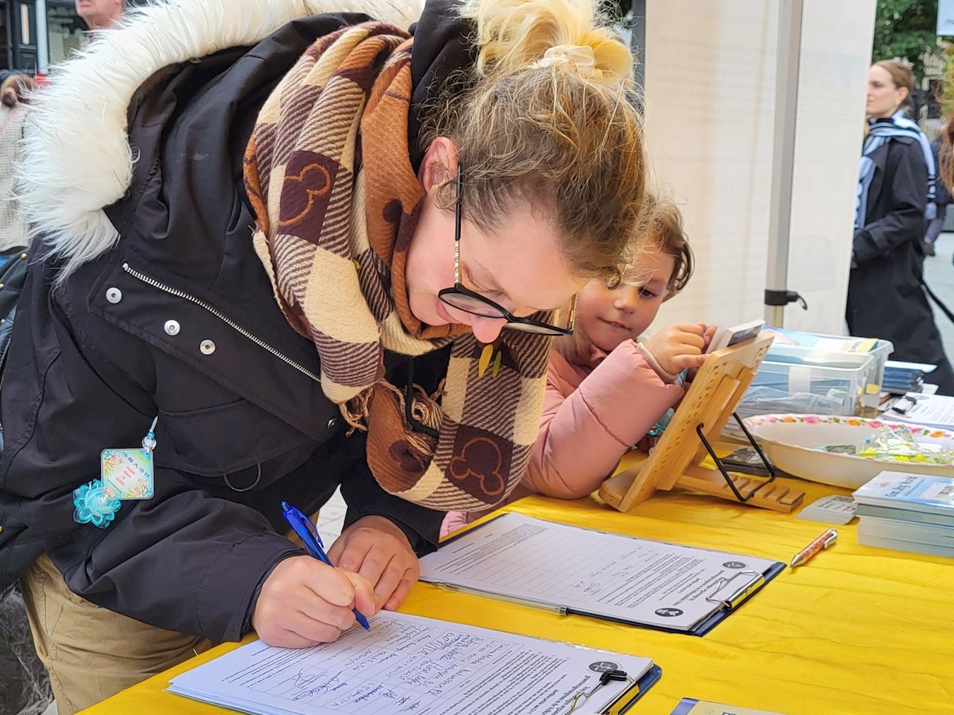 斯蒂芬妮(Stephanie)和丈夫及三个孩子看了学员们炼功,一起来到展位前。希望进一步了解法轮功功法。斯蒂芬妮说她喜欢东方的生活方式,这些电影展现了她所认可的传统价值观。当她听说中国的法轮功修炼者因为炼功和遵守真善忍而受到中共迫害时,她反应非常坚决。她说:“他们(中共)不应该这样做。他们应该让这些人有自由选择信仰的权利。打坐修炼是正确的。”他们立即签署了反对中国强制摘取器官的请愿书。 斯蒂芬妮说他们都需要更多的家庭安宁。她问学员,她的二女儿是个乖巧的小女孩,在看了学员的功法展示后,想学习打坐。询问可以学吗?学员当场教她们母女打坐,母女一起在商业街人潮的喧闹中,很有耐心地学习手部动作和闭眼打坐。她们表示回去后会继续学炼。 他们在摊位上待了很久,后来又转回来了,买《法轮功》书,才开心地回家。  图10~13:民众纷纷签名反迫害 |