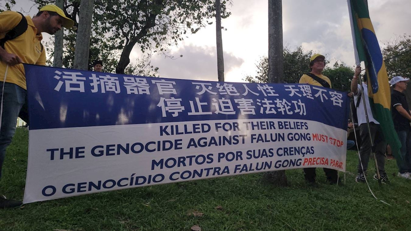 | 【明慧网二零二四年十一月二十二日】二零二四年十一月十八日至十九日,二十国集团(G20)第十九次峰会在巴西第二大城市里约热内卢(Rio de Janeiro)举行,巴西部分法轮功学员举办了系列和平抗议和讲真相活动,呼吁中共立即停止对法轮功学员的迫害。 十一月十七日,峰会举行的前一天,学员们来到格洛丽亚海滩(Praia de Gloria),向居民和游客分发真相资料,介绍什么是法轮功及一九九九年以来中共对法轮大法的残酷迫害。他们还打出横幅,要求中共立即停止强摘法轮功学员的器官。  图1~2:学员们举起反对中共迫害的真相条幅,要求中共立即停止强摘法轮功学员的器官。 |