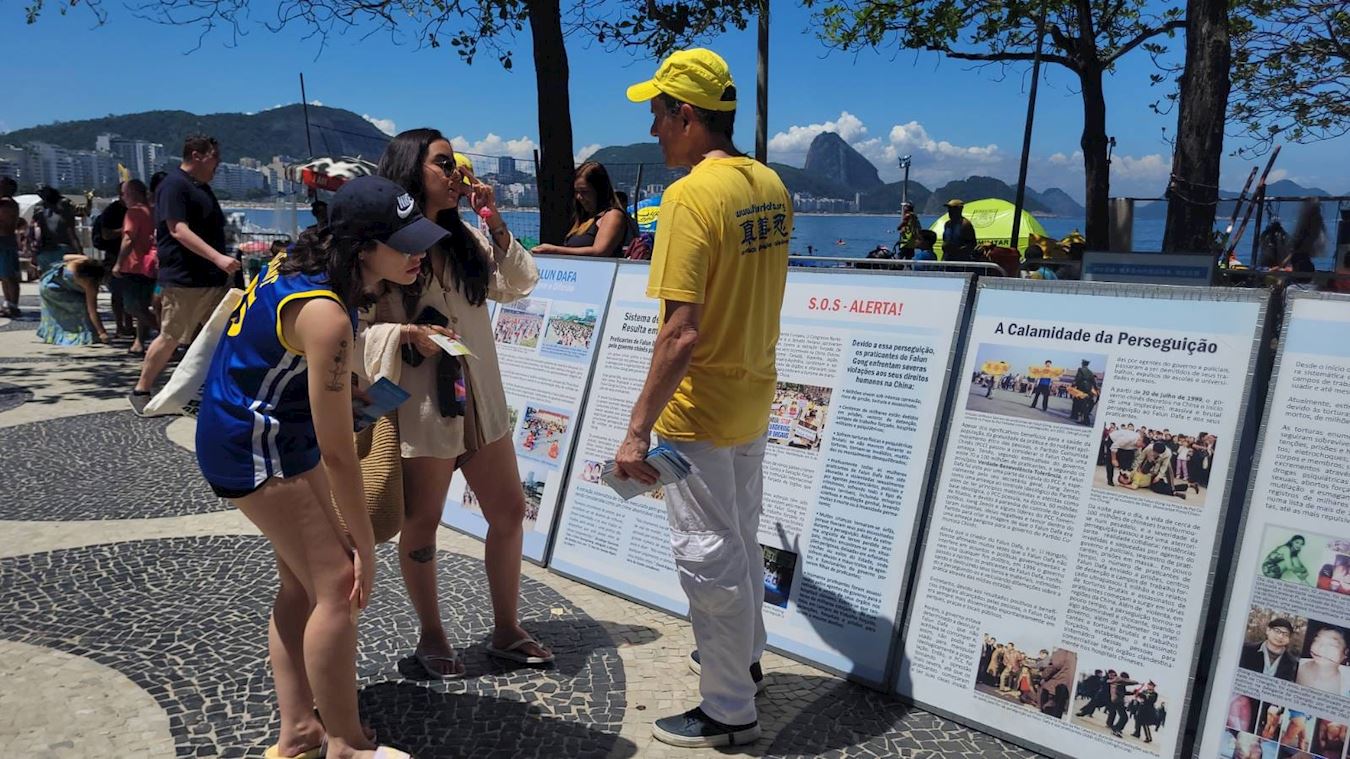 十一月十八日,学员们在科帕卡巴纳海滩(Praia de Copacabana)讲真相,向大家介绍法轮大法是和平的修炼法门,以及中共政府犯下的以法轮功学员为主要来源的强摘器官的罪行。许多人驻足与学员交谈,人们对这场迫害感到震惊,纷纷表示支持信仰和言论自由,并希望法轮功学员要继续努力坚持。  图3~4:十一月十八日,科帕卡巴纳海滩,法轮功学员正在向民众讲述法轮大法在中国遭受的迫害。 |
