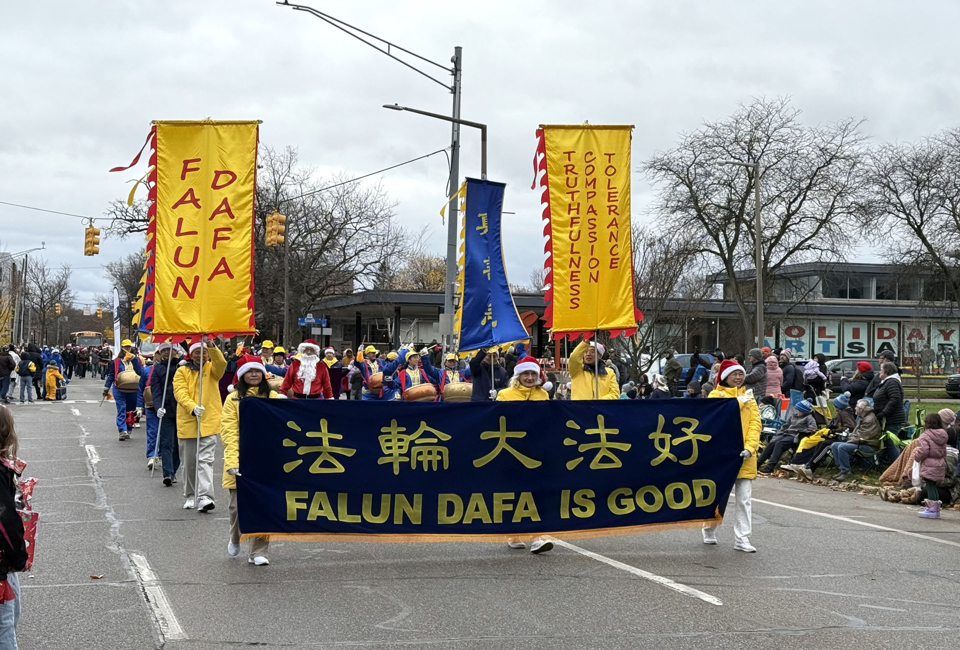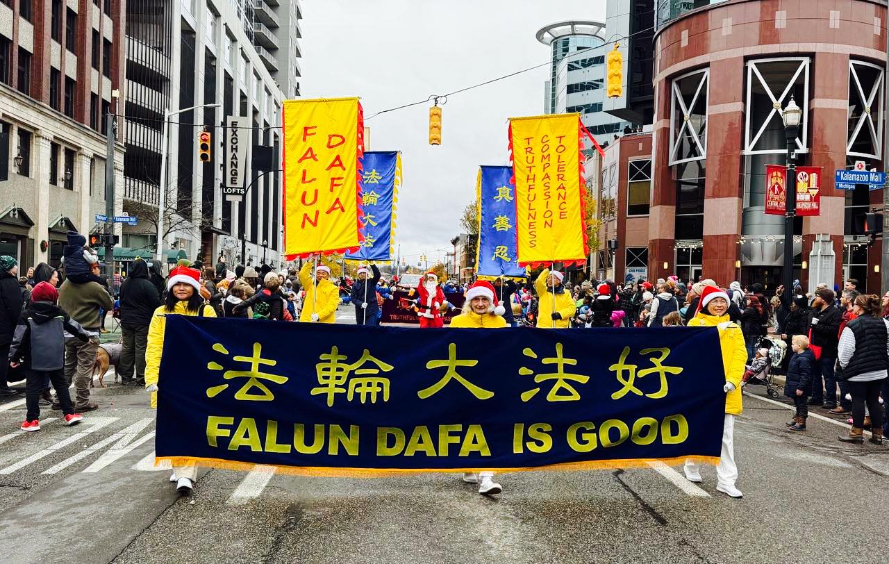 | 【明慧网二零二四年十一月二十五日】卡拉马祖(Kalamazoo)位于美国密西根州底特律市和伊利诺伊州的芝加哥市之间,交通便利。作为一个重要的文化和教育中心,这座城市以其独特的艺术氛围、多样的节日活动和丰富的教育资源而备受关注。 卡拉马祖每年都会举办各种备受欢迎的活动,其中最具代表性的是卡拉玛祖节日游行(Kalamazoo Holiday Parade)。二零二四年十一月二十三日,第六十二届卡拉玛祖节日游行拉开了序幕,这项活动是当地社区正式迎接假日季的标志,吸引了整个社区的热情参与,场面热闹非凡。今年的游行吸引了现场两万到三万的当地居民和游客,包括九十九个社区游行团体和十支高中军乐队,以节日为主题的标牌、巨型气球、花车和装扮让人目不暇接。 密西根法轮大法学会第二次参加本次盛大游行。二零二三年首次参加游行后,当地的电视台Wood TV8在节目中介绍了法轮大法学员的方阵。 二零二四年十一月二十三日,密西根州的内容涵盖该州九家报纸新闻门户网站Mlive,对本次游行的报道中,也刊登了法轮大法学会的游行方阵图片。  图1:二零二三年首次参加卡拉玛祖节日游行后,当地电视台的节目中播放了法轮功的方阵(Wood TV8电台网络截图)。 |
