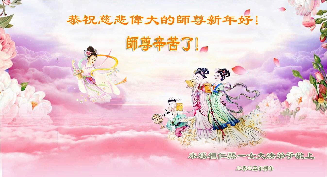 师父新年好!我们是您的老弟子,修炼快三十年了,尽管我们什么也看不见,但是我们时时刻刻感受到师父就在我们身边。我们知道修炼路上有坚冰还有魔难,但是我们坚定的心没有变。无论前面的路还有多远,我们都要跟师父回家,兑现我们的誓约。 辽宁本溪姐妹俩大法弟子敬上 二零二四年十二月十六日 辽宁省本溪市桓仁县两个大法弟子恭祝师尊新年快乐!弟子叩拜恩师!
