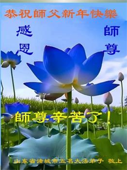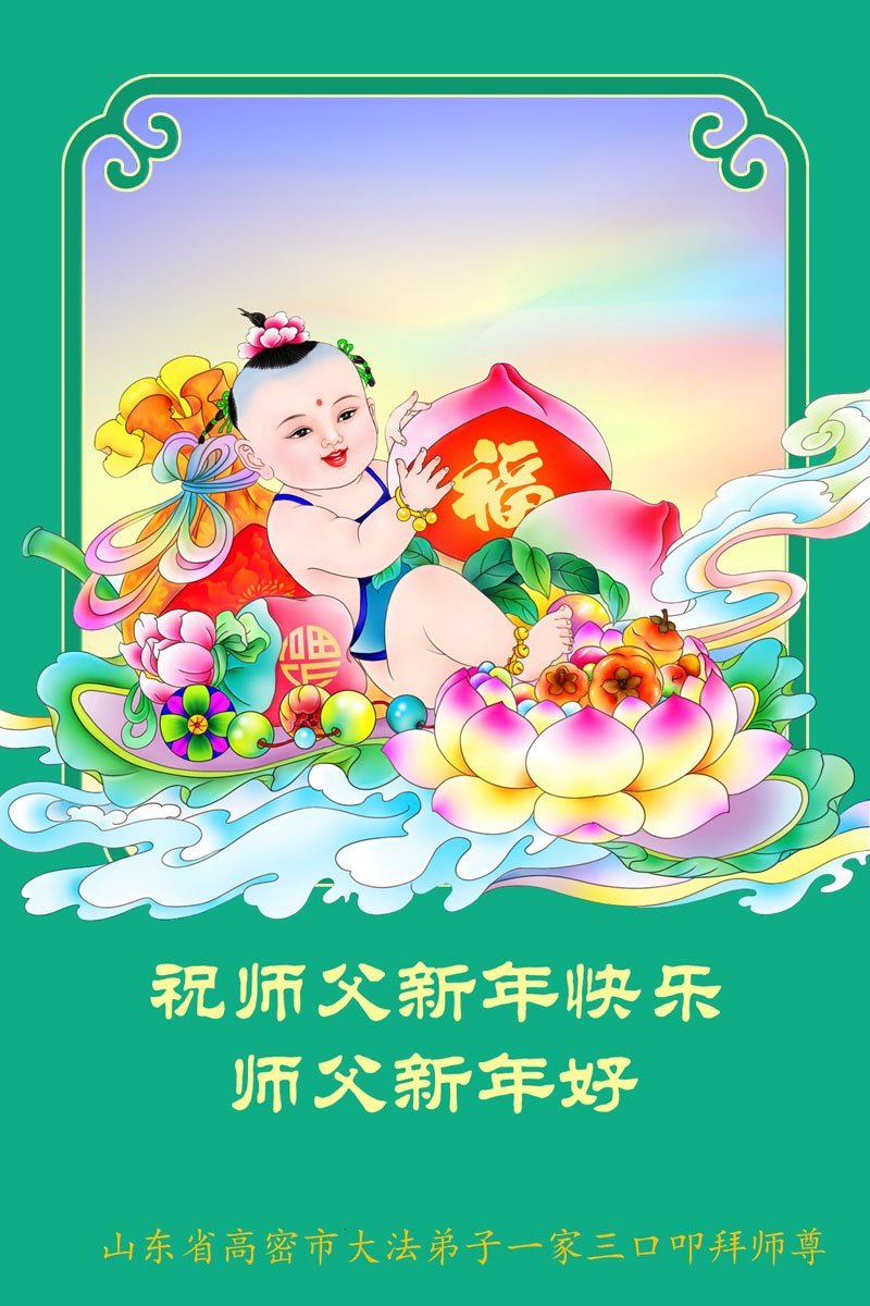 山东省潍坊市高密市一大法弟子及儿子儿媳恭祝慈悲伟大的师父新年快乐!