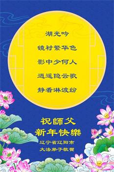 恭祝师尊新年快乐! 师尊教诲记心中 严寒酷暑从未停 风雨无阻世间行 讲清真相送福音 师尊救度返天庭 辽宁省辽阳市大法弟子敬上 辽宁省辽阳市大法弟子恭祝师尊新年快乐!