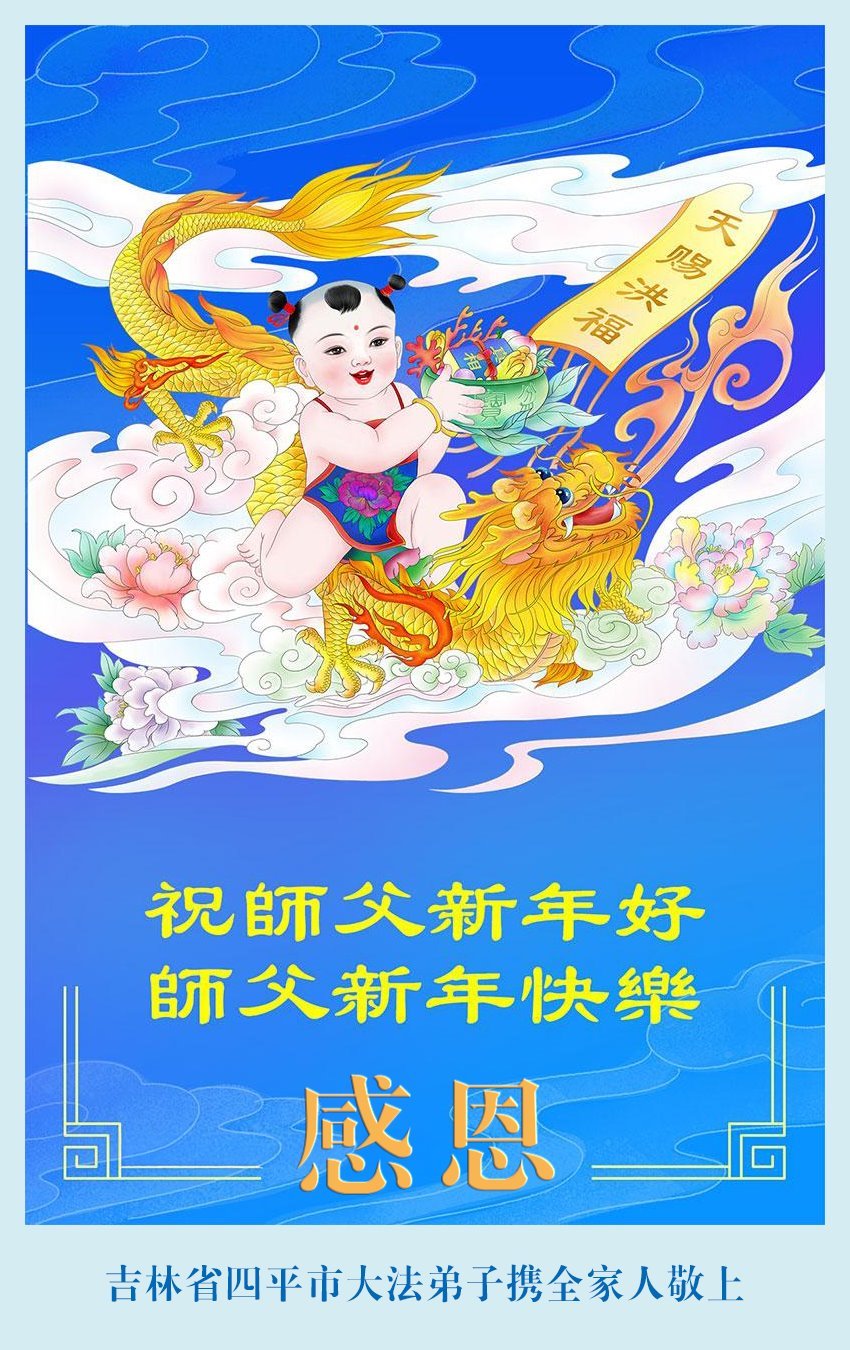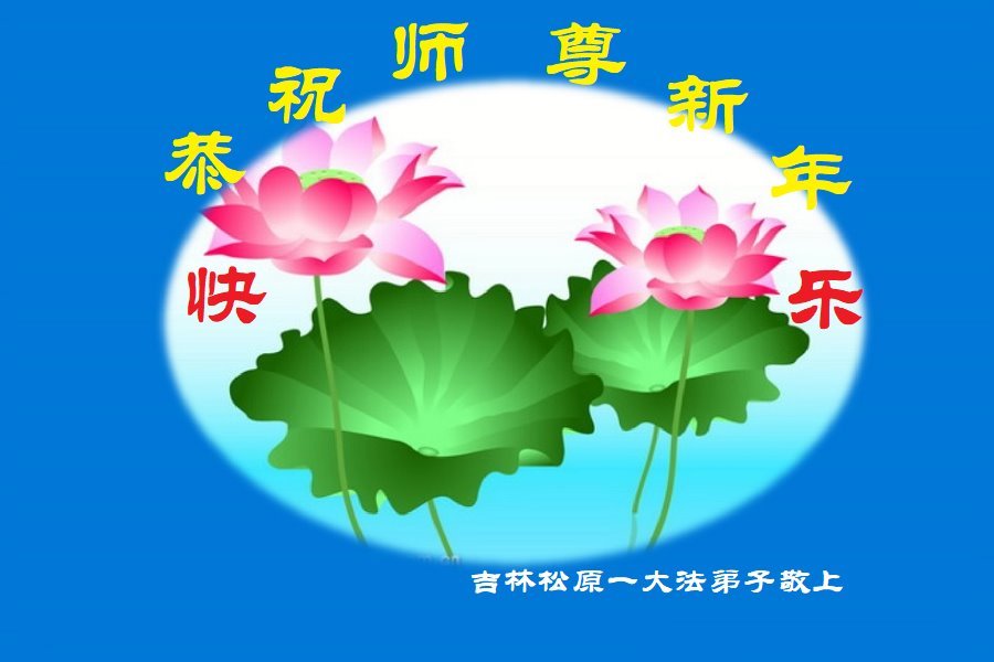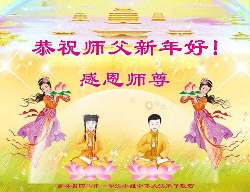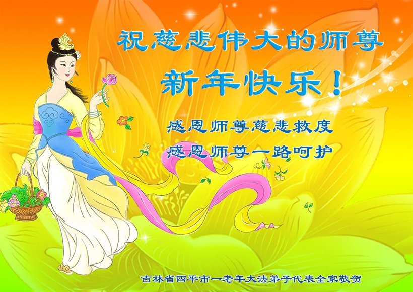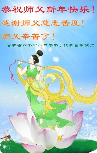 恭祝慈悲伟大的师尊新年快乐! 感恩师尊慈悲救度!感恩师尊一路保护! 吉林省四平市一老年大法弟子代表全家敬上 吉林省四平市一大法弟子偕全家敬祝慈悲伟大的师尊新年快乐!