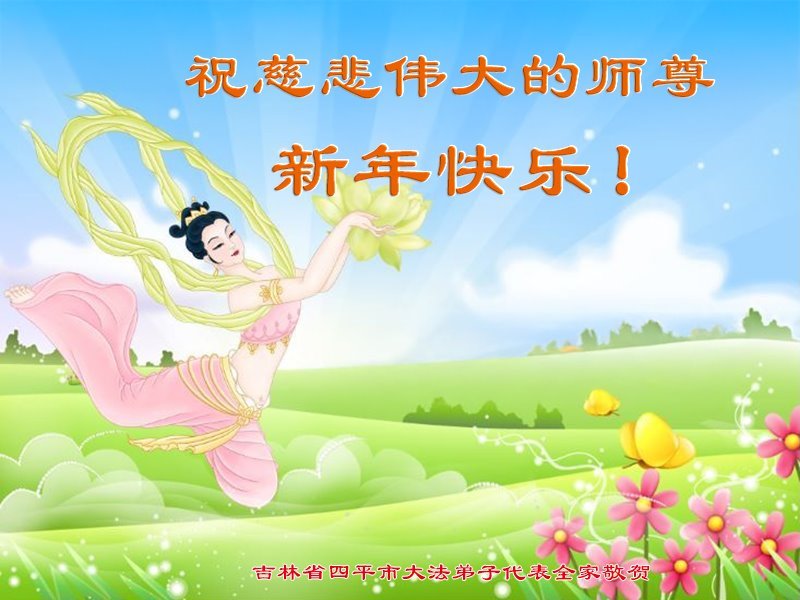 敬祝慈悲伟大的师尊新年快乐! 吉林省四平市一大法弟子偕全家敬上 吉林省四平市一大法弟子代表全家敬贺师尊新年快乐!
