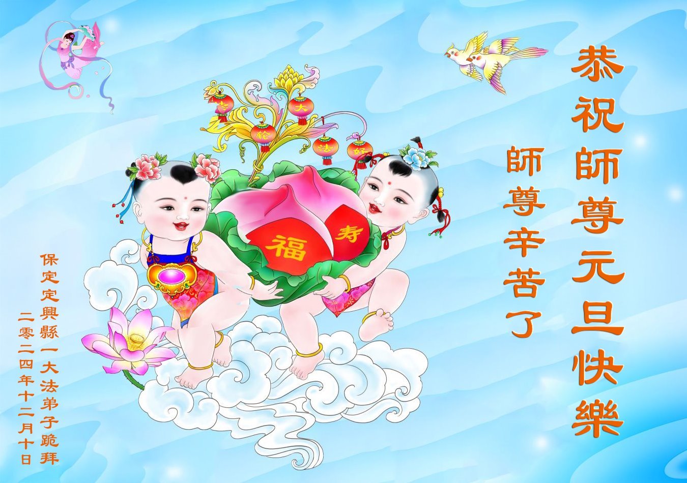 元旦即将到来,恭祝师父新年好! 感谢恩师的慈悲苦度,叩谢师恩! 河北省雄县大法弟子敬上 二零二四年十二月十日 河北省保定市定兴县一家庭学法小组大法弟子祝贺师尊新年好!