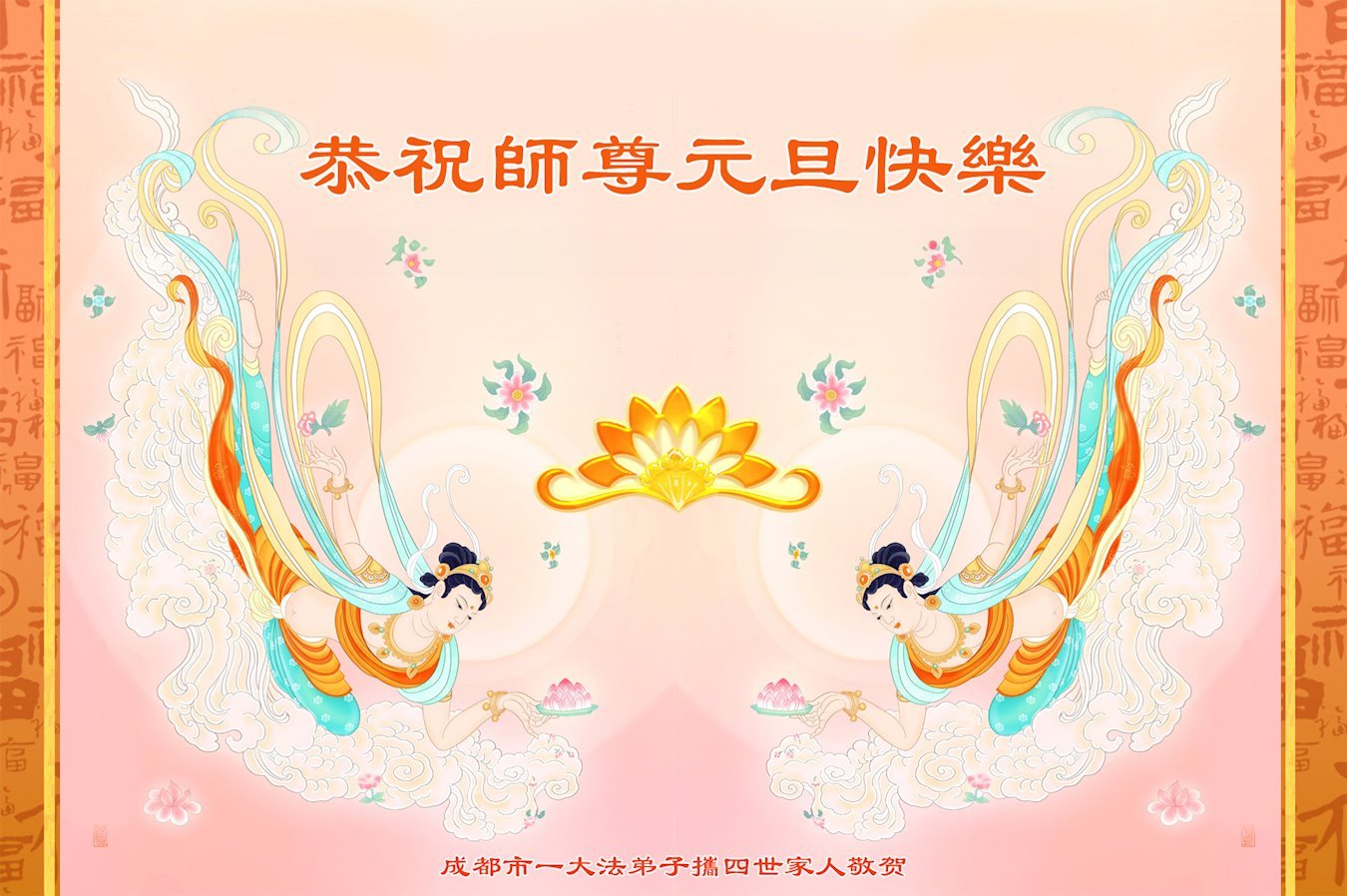 恭祝慈悲伟大的师尊元旦快乐! 四川省成都市一大法弟子携四世家人敬上 四川省成都市龙泉驿区一老年大法弟子携八口家人恭祝慈悲伟大的师父新年快乐!