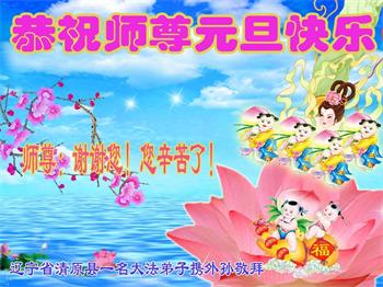 辽宁省抚顺市清原县一名大法弟子携外孙恭祝师尊元旦快乐!