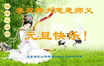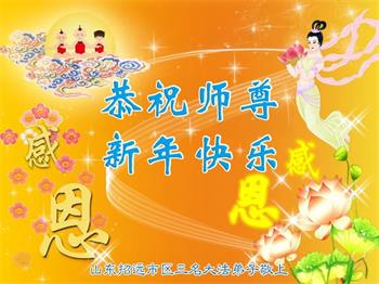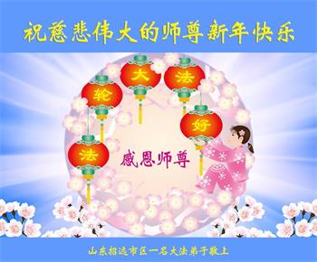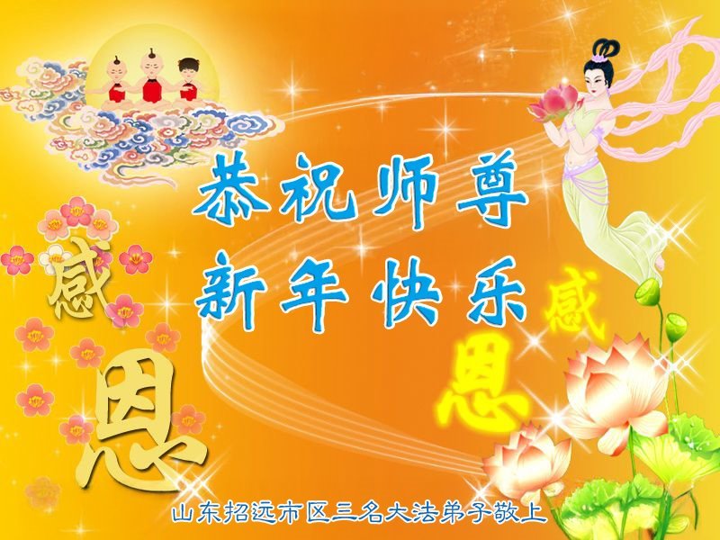 恭祝师父新年快乐! 山东省济宁市梁山一大法弟子敬上 山东省烟台市招远市区一名大法弟子恭祝慈悲伟大的师尊新年快乐!