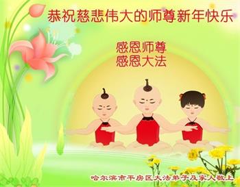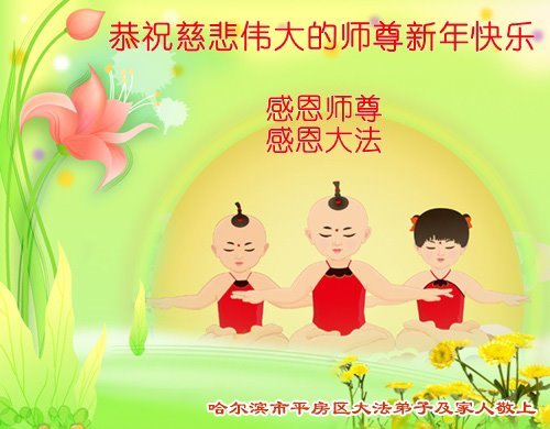 恭祝慈悲伟大的师尊新年快乐! 感恩师尊,感恩大法。 黑龙江省哈尔滨市平房区大法弟子及家人敬上 黑龙江哈尔滨市平房区一学法小组大法弟子恭祝慈悲伟大的师尊新年快乐!