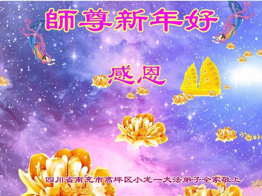 恭祝无量慈悲伟大的师尊元旦快乐!新年好! 尊敬的师尊:您好!您辛苦了! 四川省南充市高坪区母子俩大法弟子敬上 四川省南充市高坪区小龙一大法弟子全家叩祝无量慈悲伟大的师尊元旦快乐!新年好!
