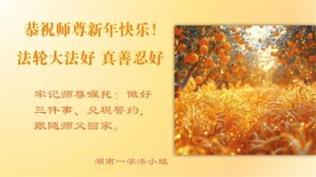 我们一定要学好法、理解好法,修好自己,多救人,做好三件事,紧跟正法進程,跟师父回家! 湖南一学法小组大法弟子恭祝师尊新年快乐!