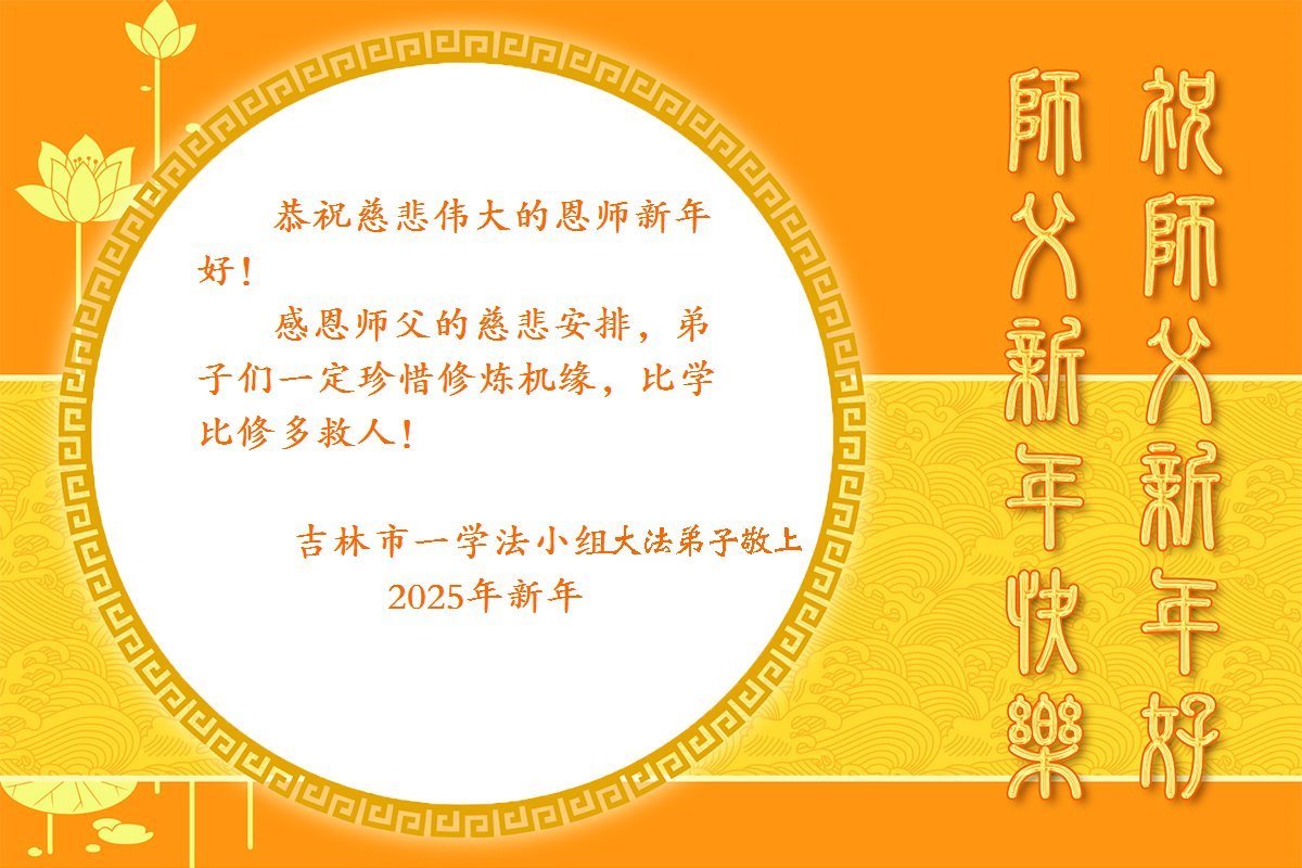 恭祝伟大的师尊新年快乐! 吉林省吉林市两位大法弟子敬上 二零二四年十二月十八日 吉林省吉林市一学法小组大法弟子恭祝慈悲伟大的师尊元旦快乐!
