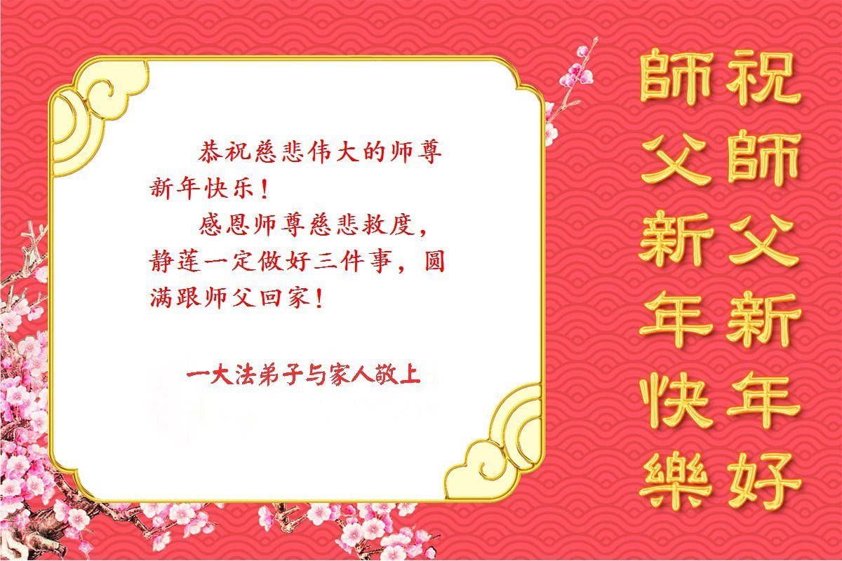恭祝师尊新年快乐! 感恩师尊慈悲苦度!无限感恩师尊为天地苍生所付出所承受的一切!弟子永不负师尊救度之恩!叩首再叩首! 吉林省吉林市二人学法小组大法弟子敬上 二零二四年十二月二十日 吉林省吉林市一老大法弟子携家人恭祝师尊新年快乐!